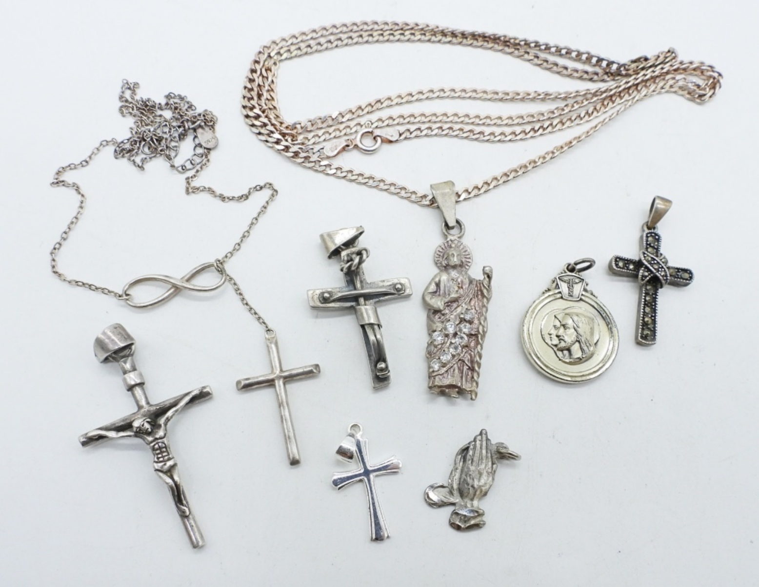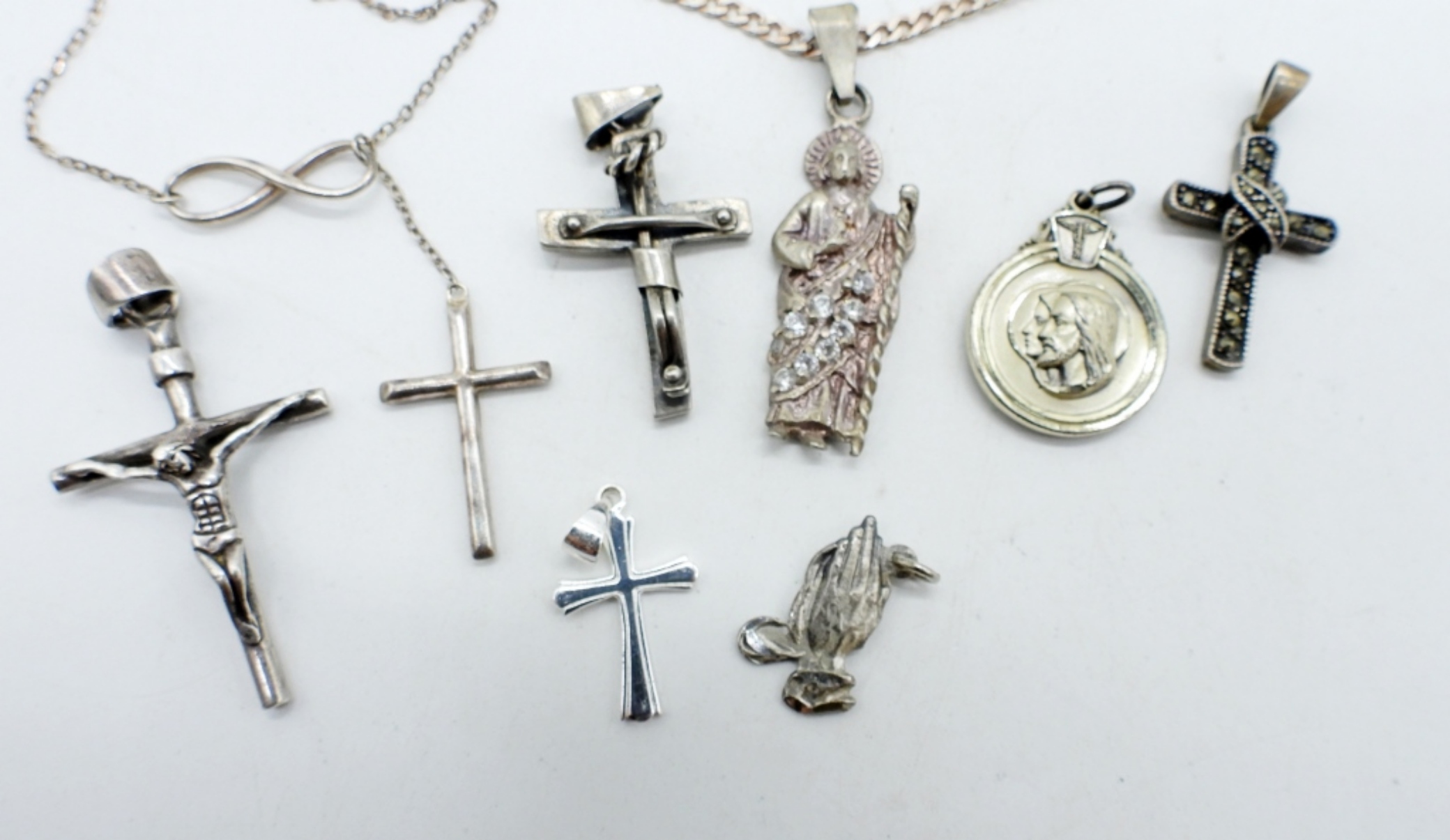8 CHRISTIAN RELIGION CHARMS. NECKLACES ARE 19 & 30″. (28 DWT)