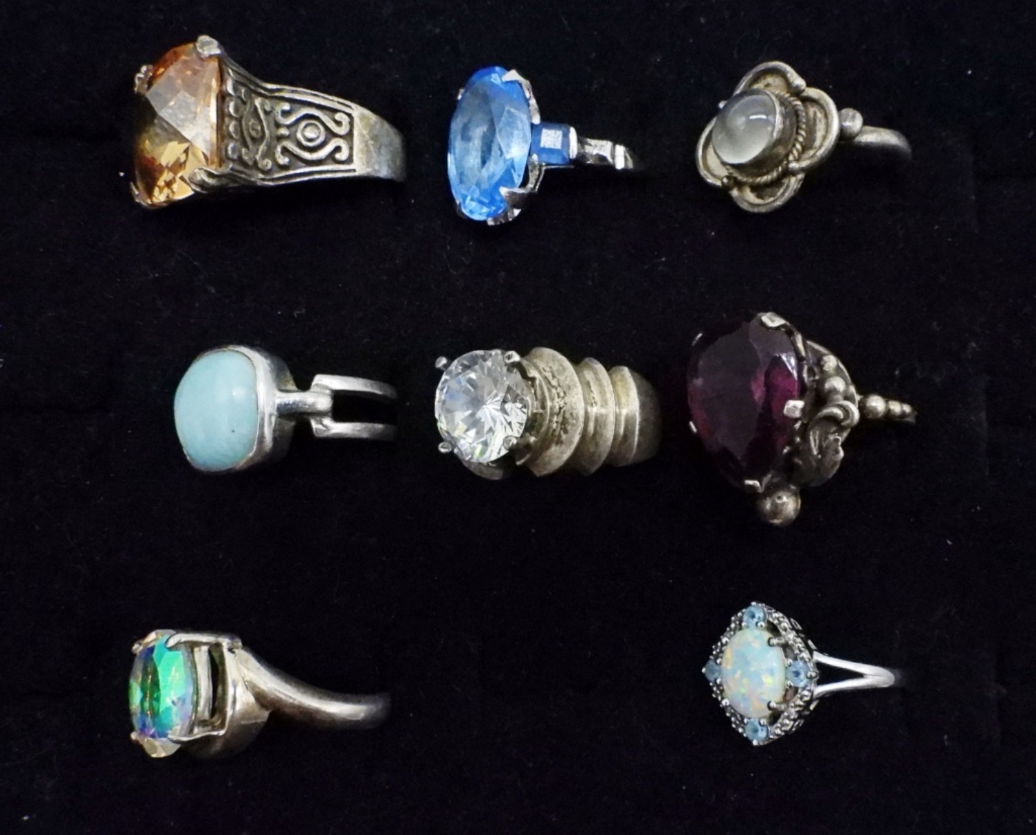 8 STERLING GEMSTONE RINGS. SIMULATED DIAMONDS, LARIMAR, OPAL, SIMULATED AMETHYST, & OTHER SIMULATED STONES. SIZES 7-8. (36 DWT)