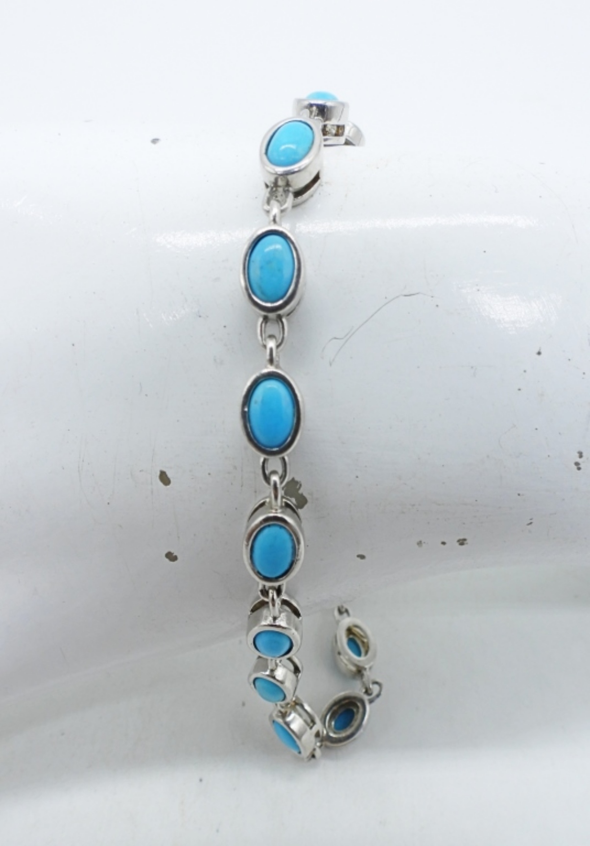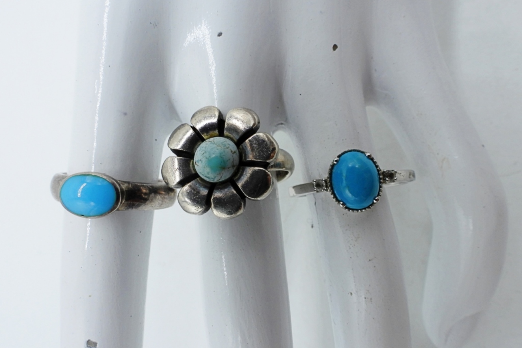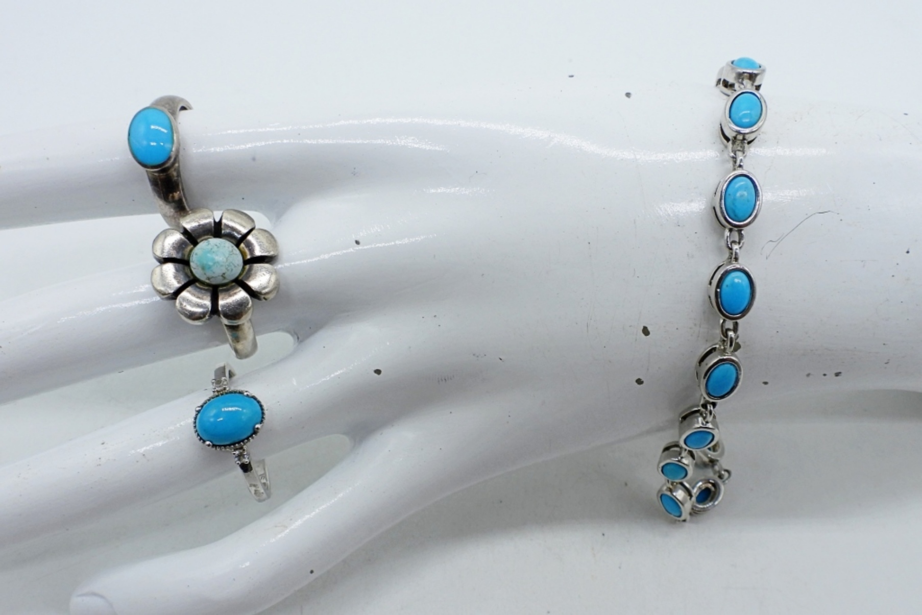 STERLING TURQUOISE BRACELET, 8″ MISSING ONE STONE. THREE STERLING TURQUOISE RINGS, SIZES 7 & 10. (17.7 DWT)