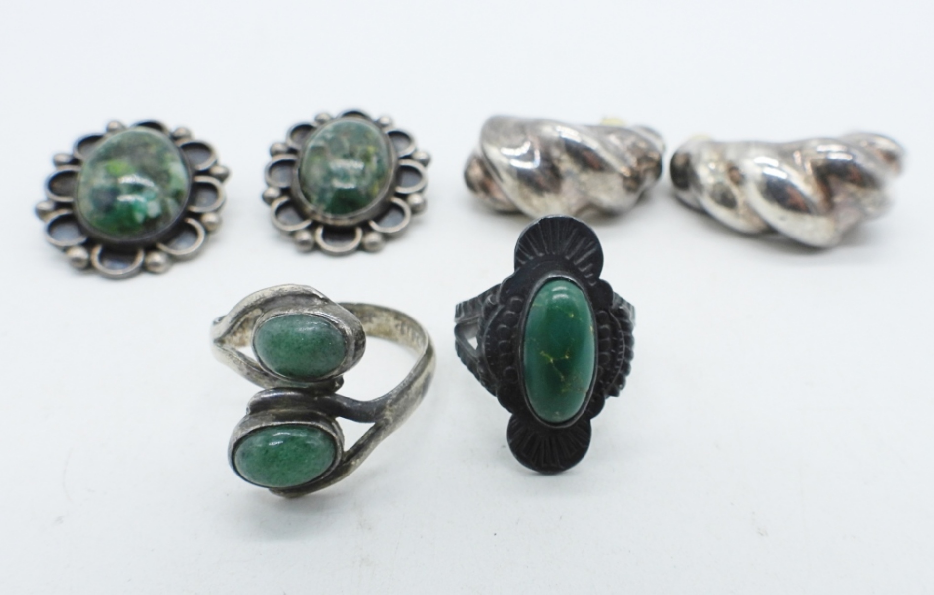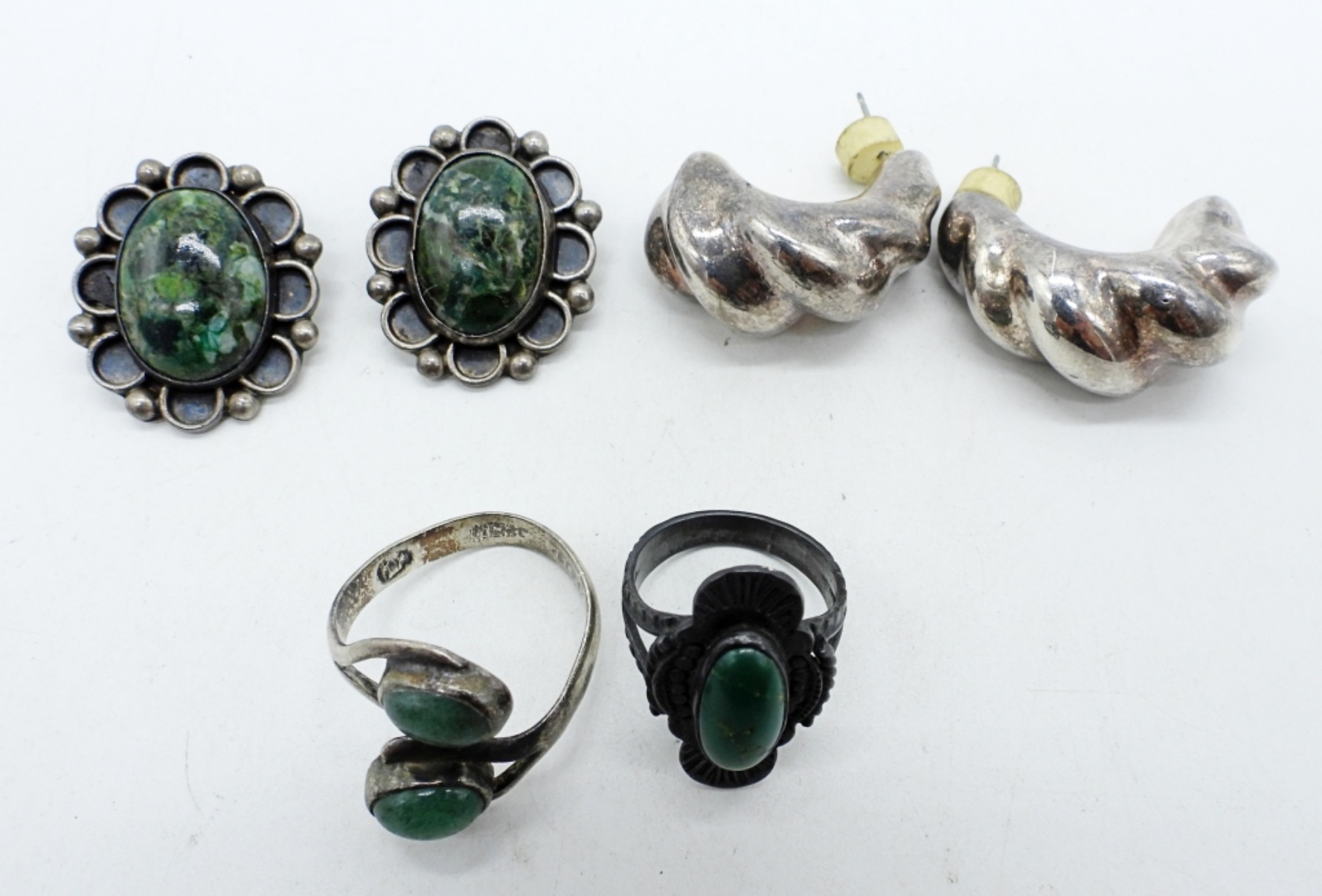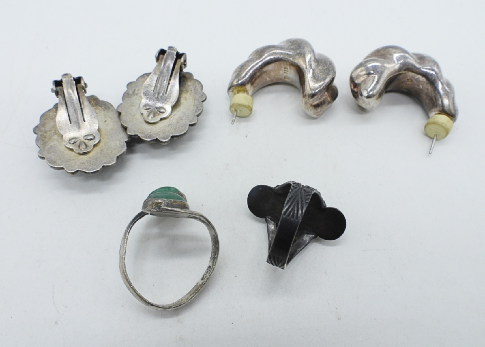 TWO PAIR OF EARRINGS. ONE PIERCED ONE CLIP ON. TWO STERLING RINGS, SIZES 7 & ADJUSTABLE. ONE HAS A BENT BAND. (23.3 DWT)