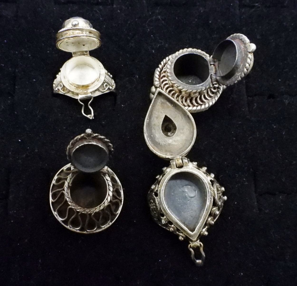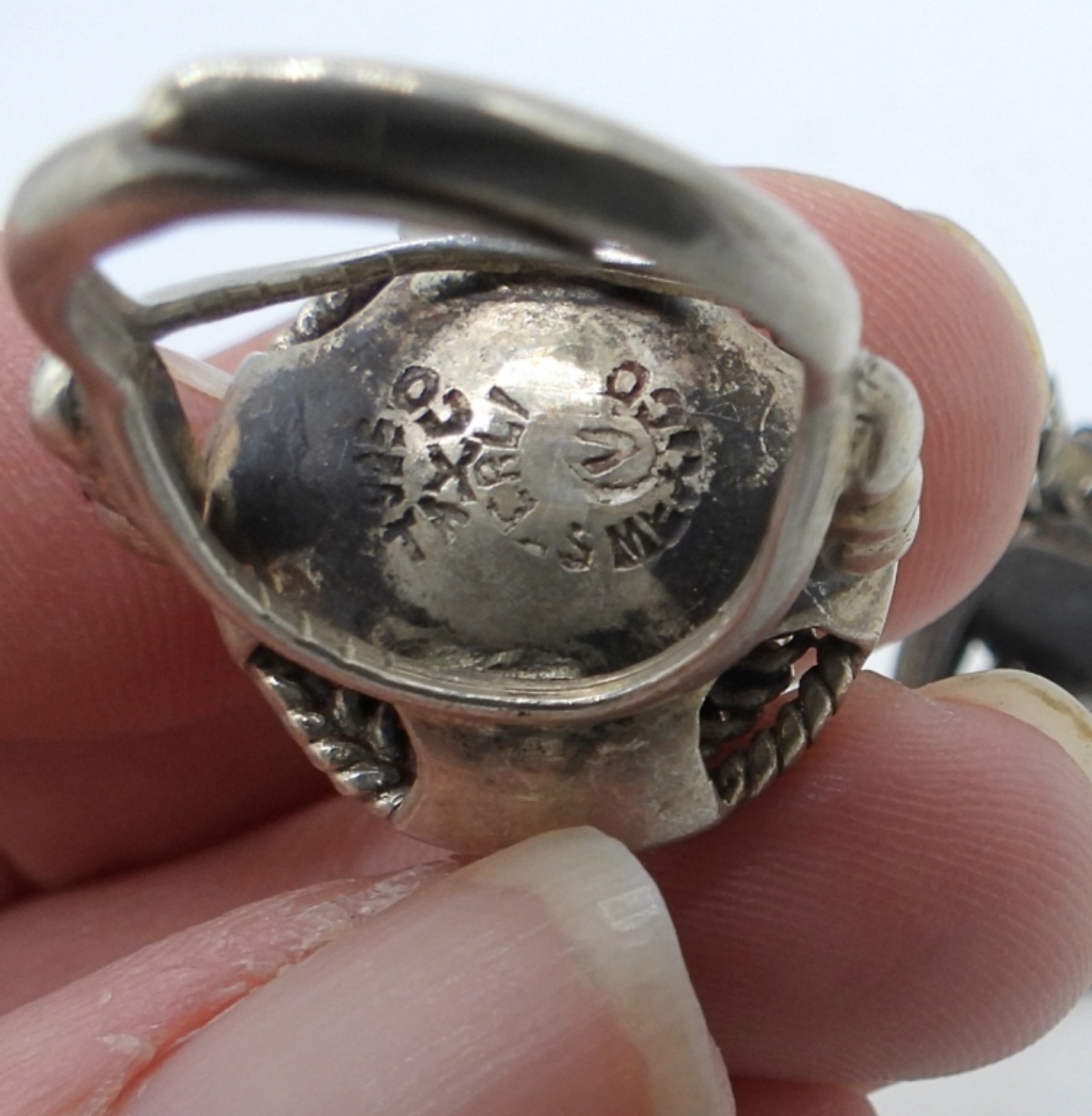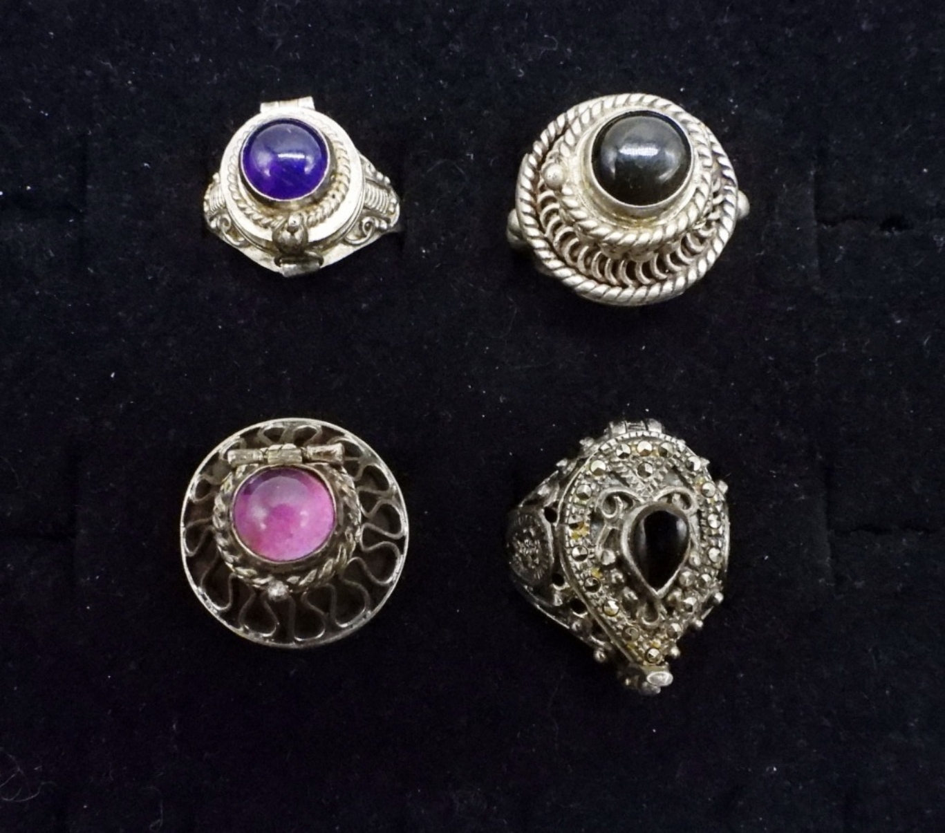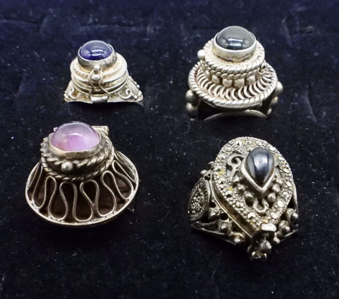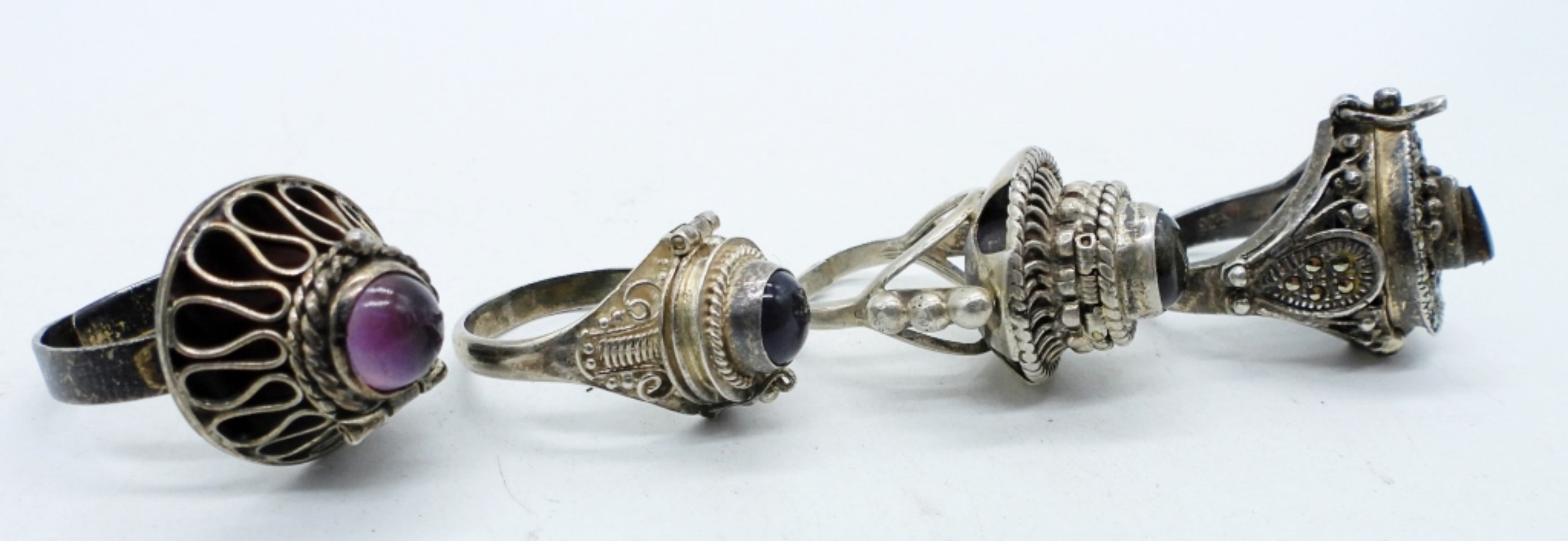 FOUR VINTAGE STERLING POISON RINGS. SIZES 5-8. TAXCO RING MARKED “925 TAXCO MEXICO V”. TWO RINGS ARE ADJUSTABLE. (20 DWT)