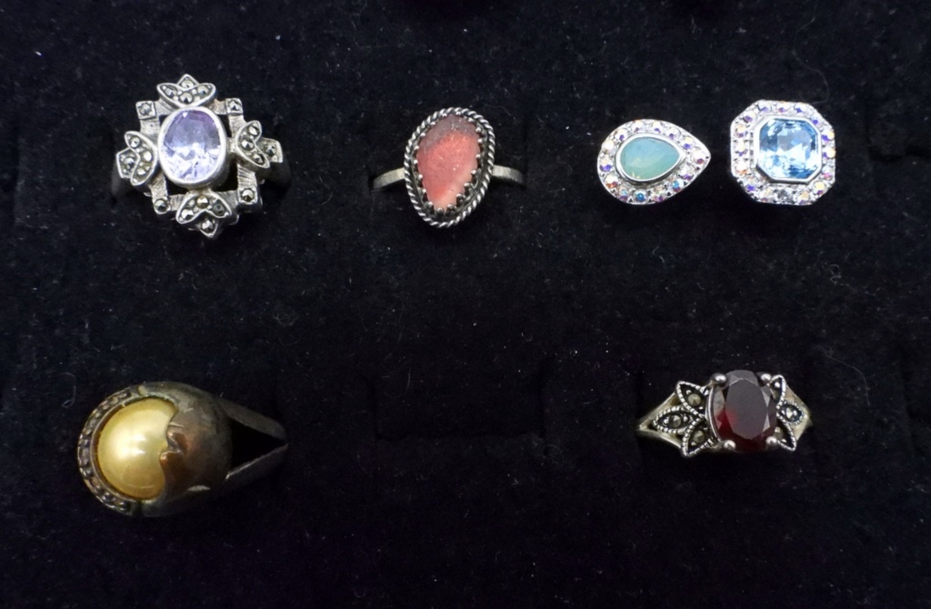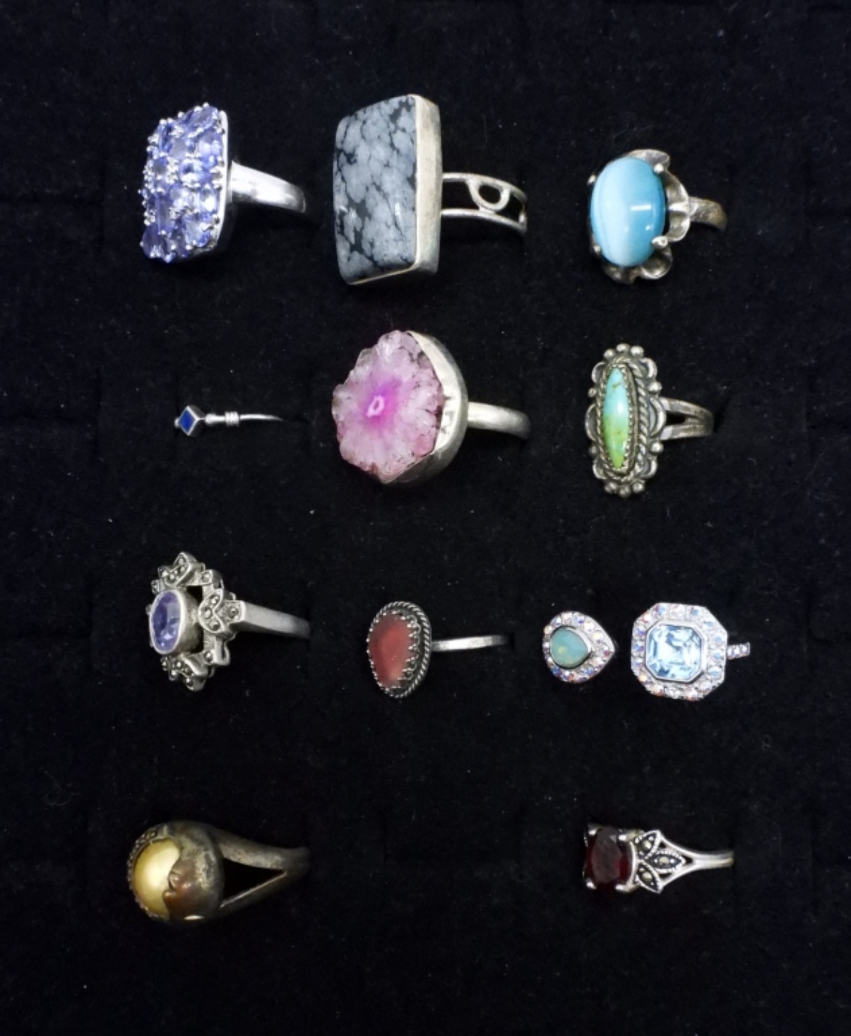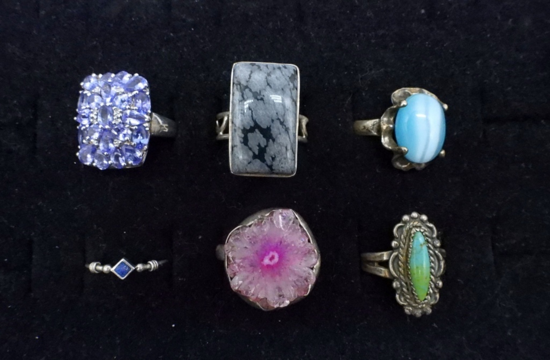 11 STERLING GEMSTONE RINGS, SIZES 5-10. TURQUOISE, DRUZY, AMETHYST & MORE. (30 DWT)