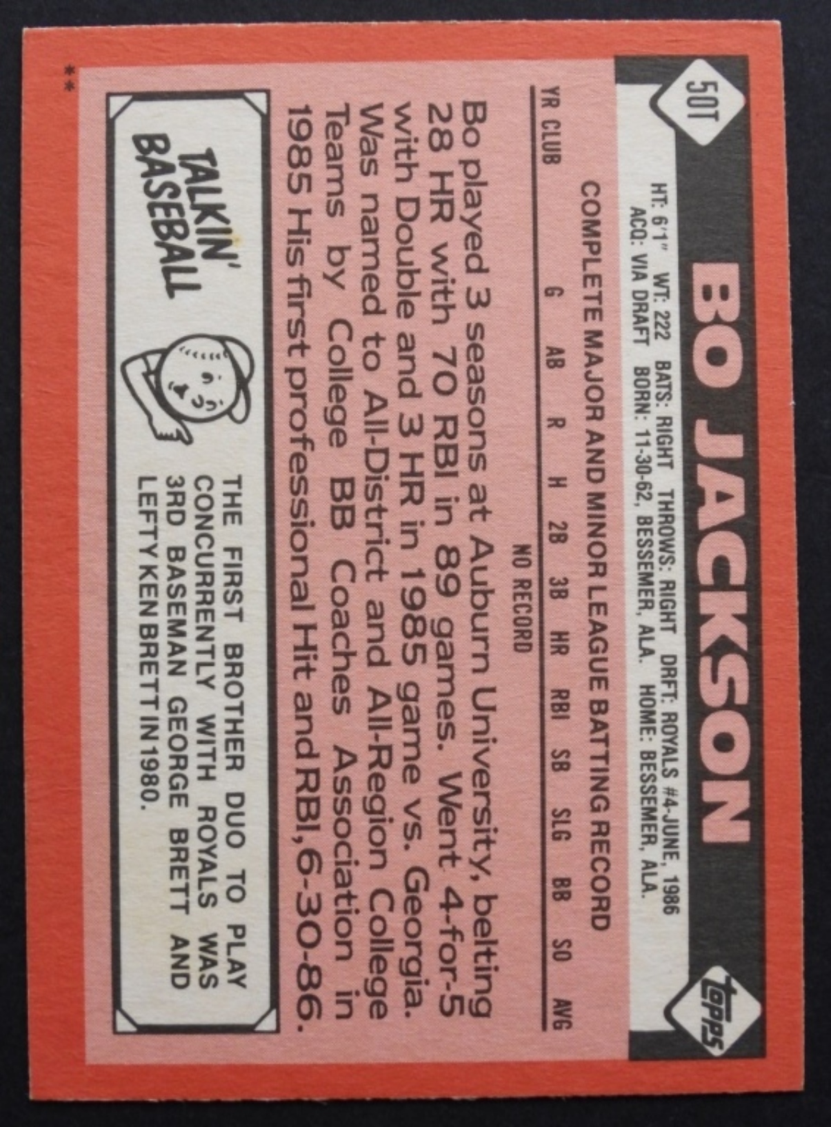 1986 TOPPS TRADED BO JACKSON SIGNED CARD