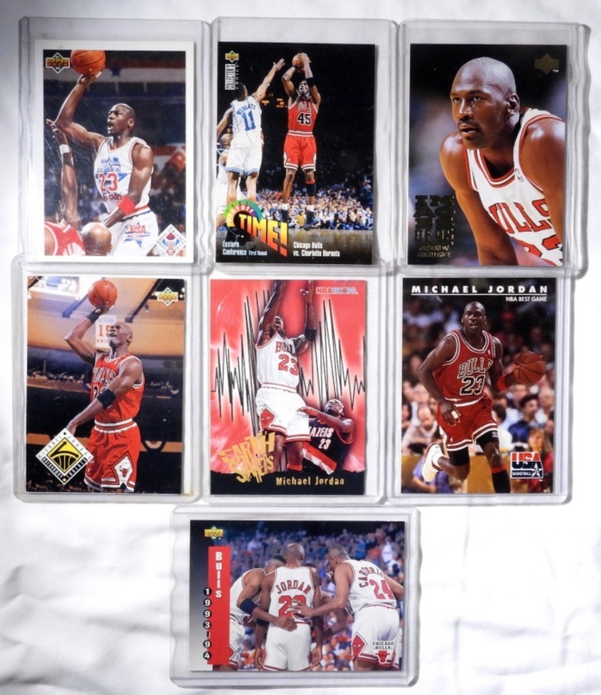 (7) VARIETY MICHAEL JORDAN SPORTS CARD, BRANDS/NUMBERS (SKYBOX1992 40, 1996 358, UPPER DECK 1995 335, 1995 353, 1991 48, 1993 438, 1993-94 213), (EX)
