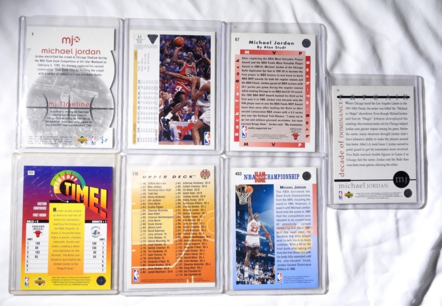 (7) VARIETY MICHAEL JORDAN SPORTS CARD, BRANDS/NUMBERS (UPPER DECK 1991 44, 1992 67, 1994 79, 1992 453, 1993 110, 1995 353, 1998 8), (EX)