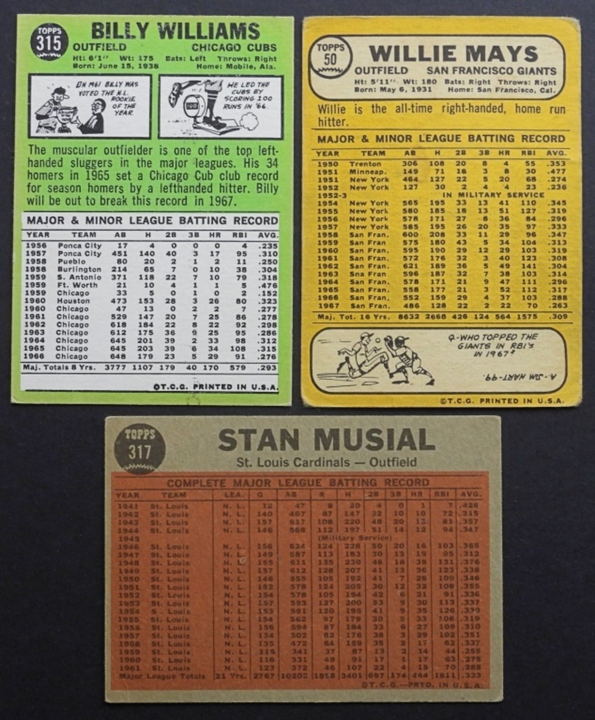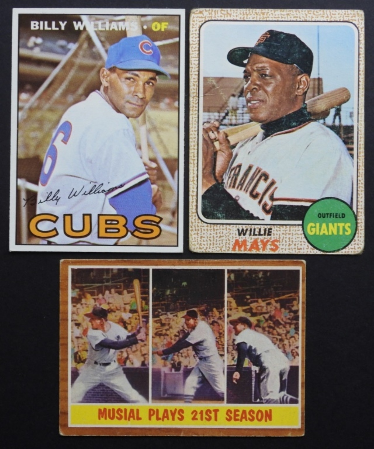 1968 TOPPS WILLIE MAYS GOOD, 1967 TOPPS BILLY WILLIAMS EM & 1962 TOPPS MUSIAL #317 VGEX