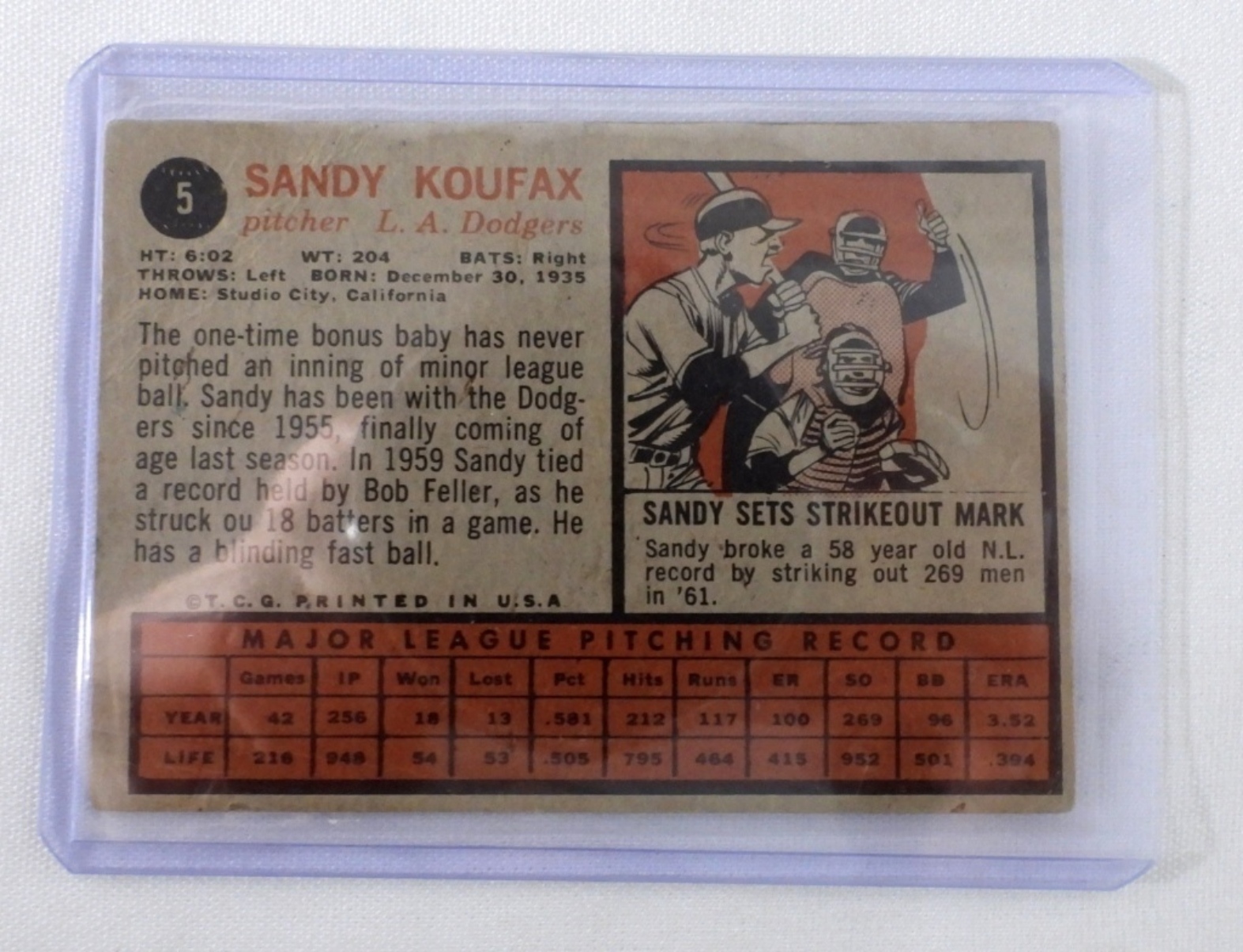 1962 #5 TOPPS SANDY KOUFAX BASEBALL CARD (VG)
