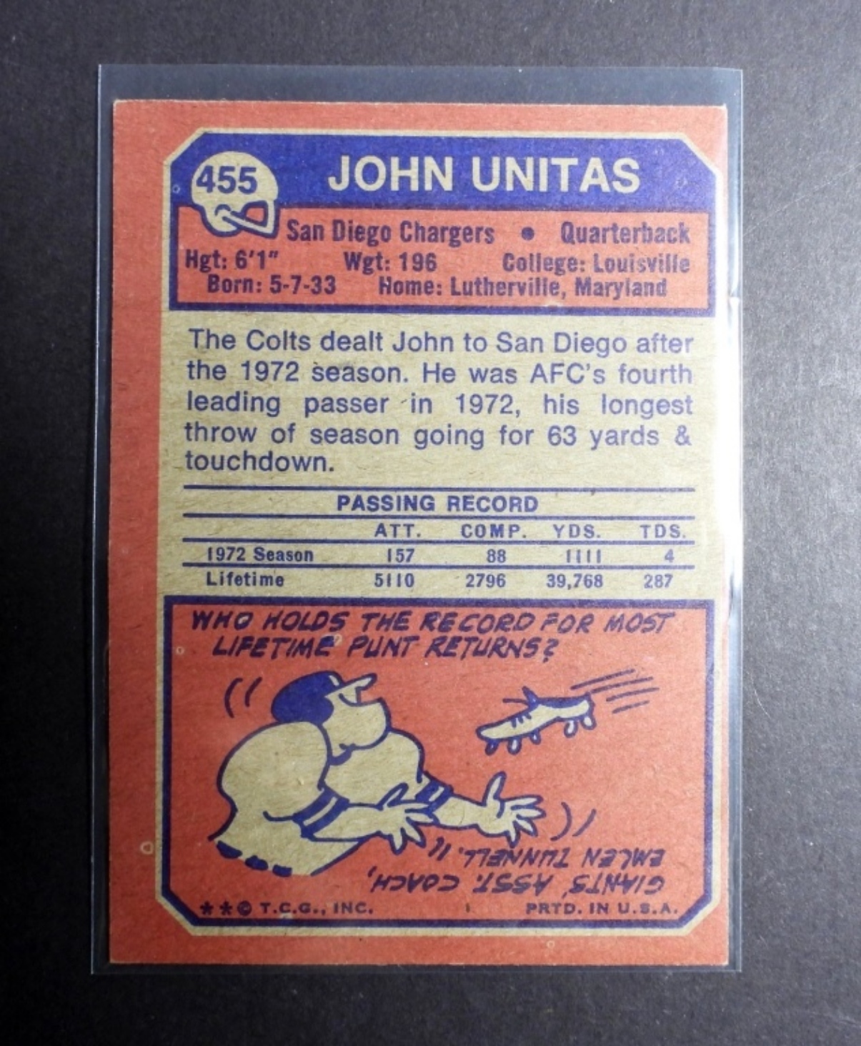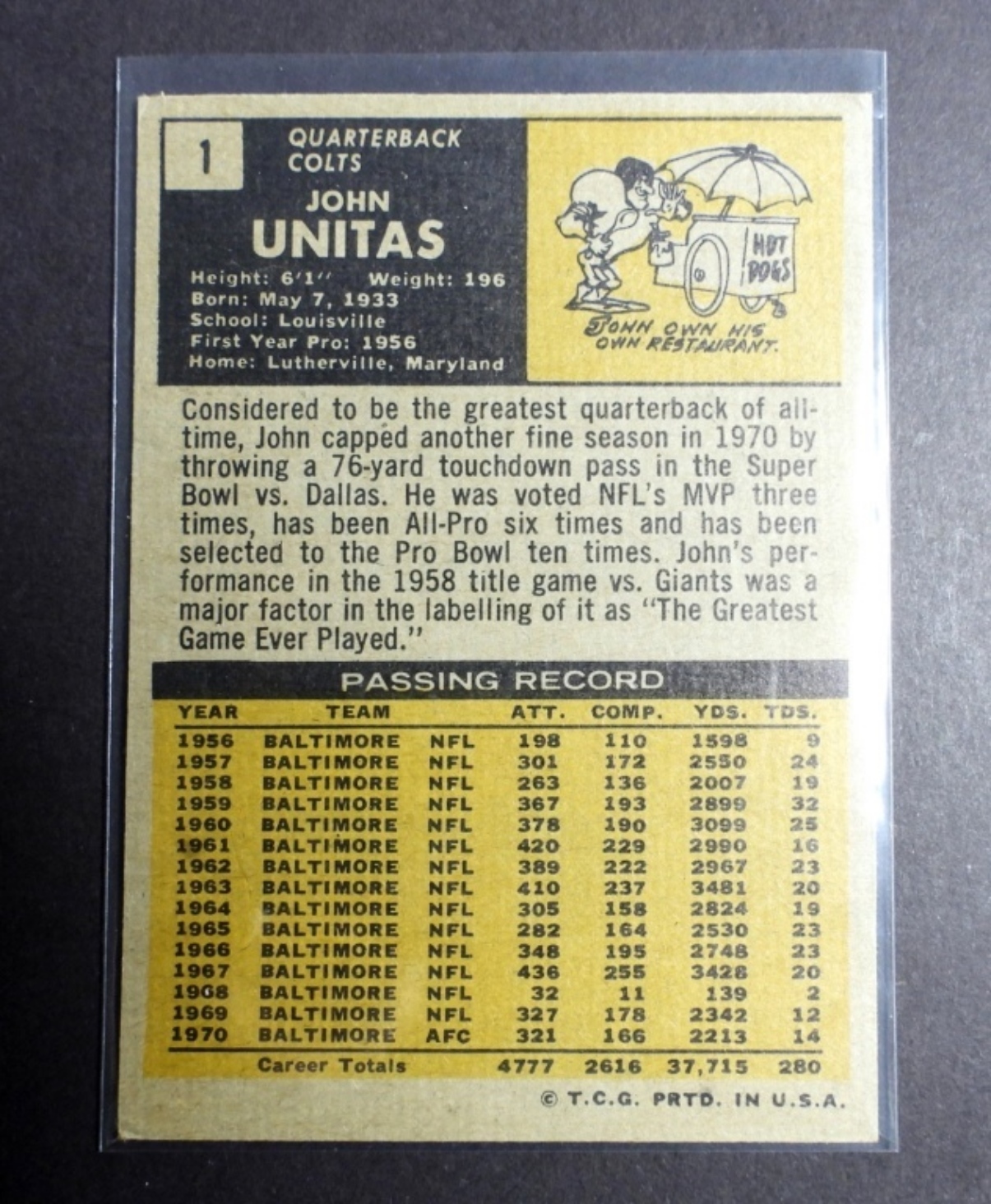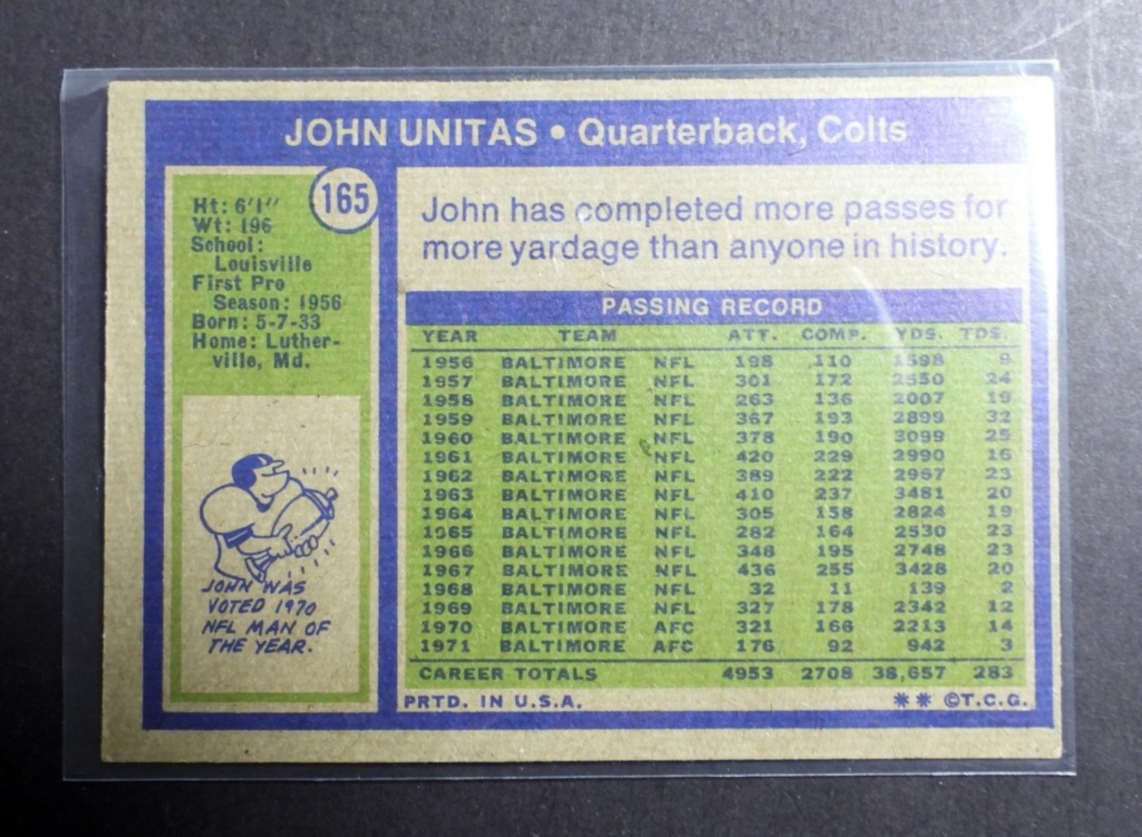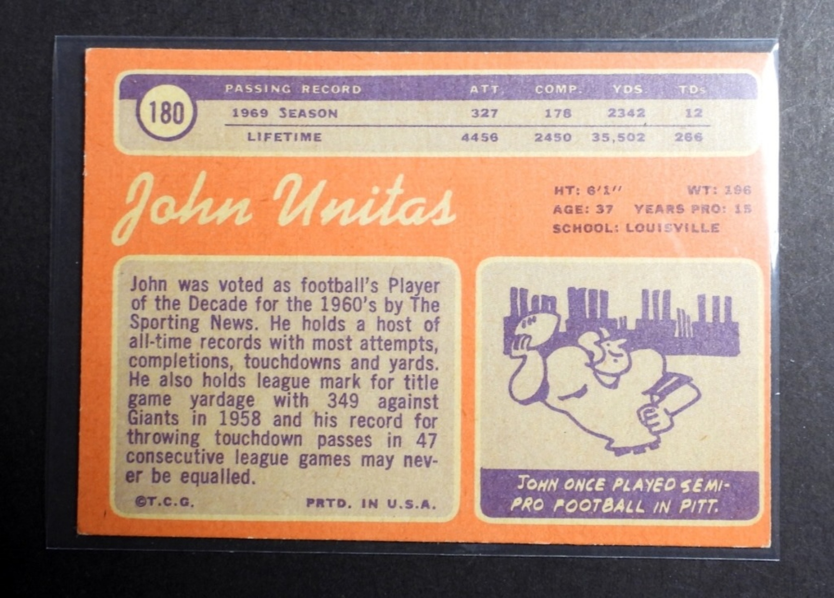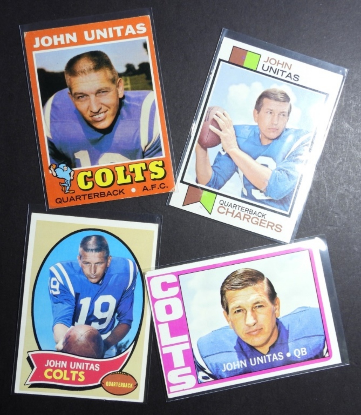 (4) VARIETY JOHN UNITAS TOPPS FOOTBALL CARDS, NUMBERS 1970 70T #180, 1971 71T #1, 1973 73T #455, AND 1972 72T #165, (VGEX)