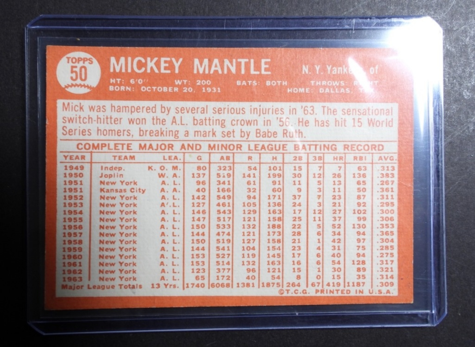 1964 TOPPS X MICKEY MANTLE BASEBALL CARD #50 (VG) HAS CREASE