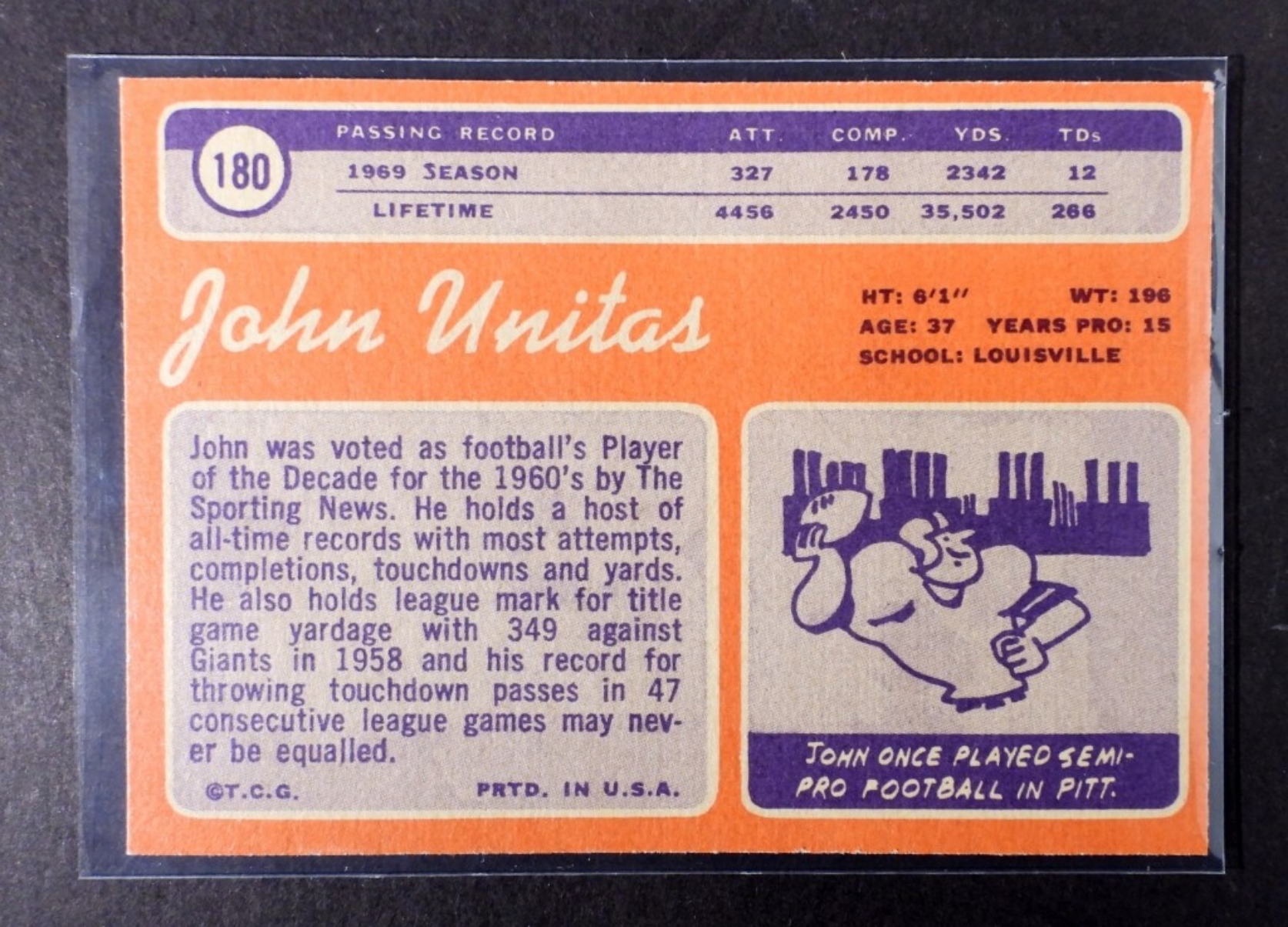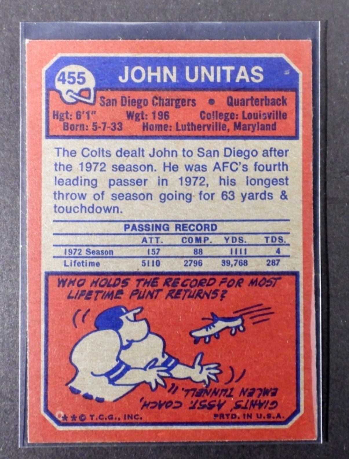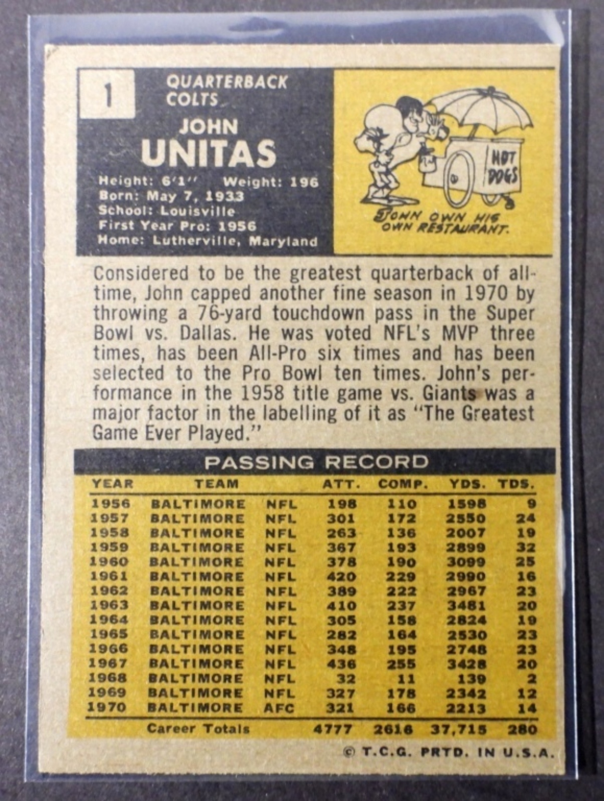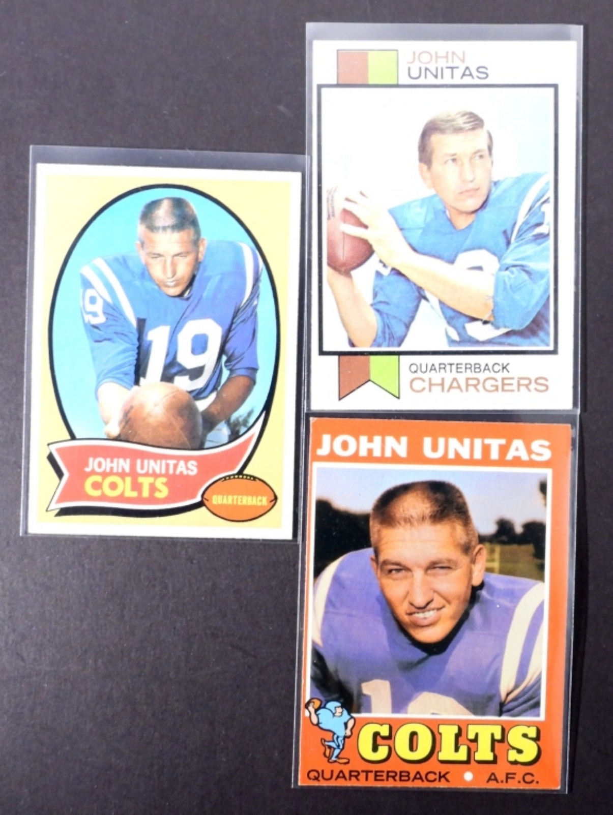 (3) VARIETY JOHN UNITAS TOPPS CARDS, NUMBERS 73 TOPPS #455, 71 TOPPS #1, AND 70 TOPPS #180 (VGEX/EX)