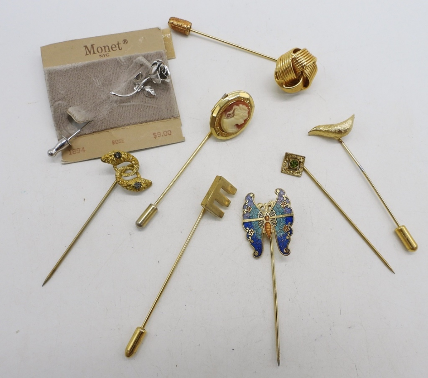 EIGHT VINTAGE STICK PINS, GOLD AD SILVER TONES.