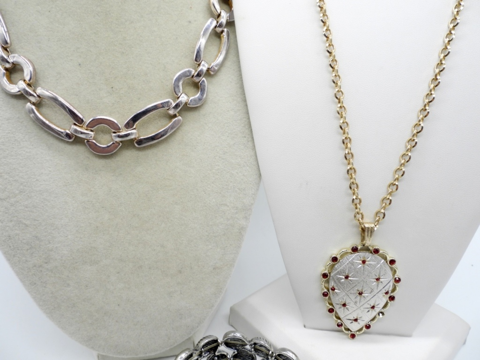 SILVER TONE EMMONS BRAND NECKLACE WITH RED GEMSTONES, ON A 16″ CHAIN. TWO FASHION NECKLACES, 16″ & 28″. FOUR FASHION BRACELETS 7-8″.