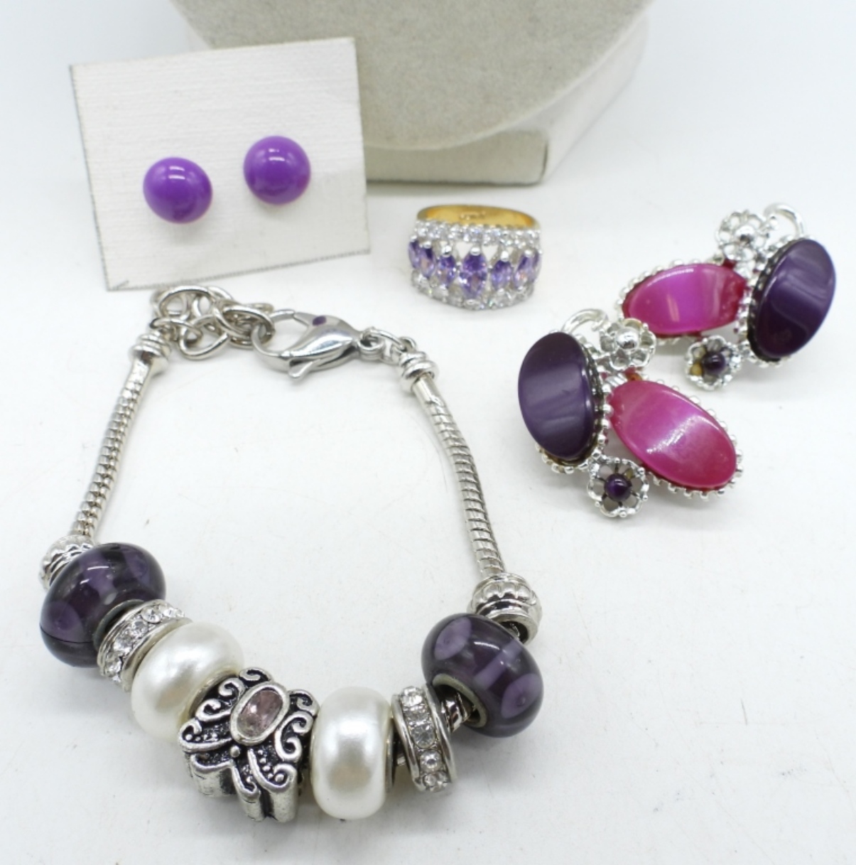 PURPLE BEADED NECKLACE, 20″. BEADED BRACELET, 8.5″ ADJUSTABLE. TWO PAIR OF EARRINGS, PIERCED & CLIP ON. RING SIZE 5.