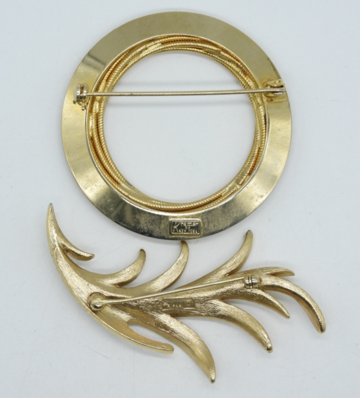 ON KRAMER CIRCLET BROOCH. ONE TRIFARI LEAF BROOCH. FIVE OTHER GOLD TONE BROOCHES. 1.5-3.5″.