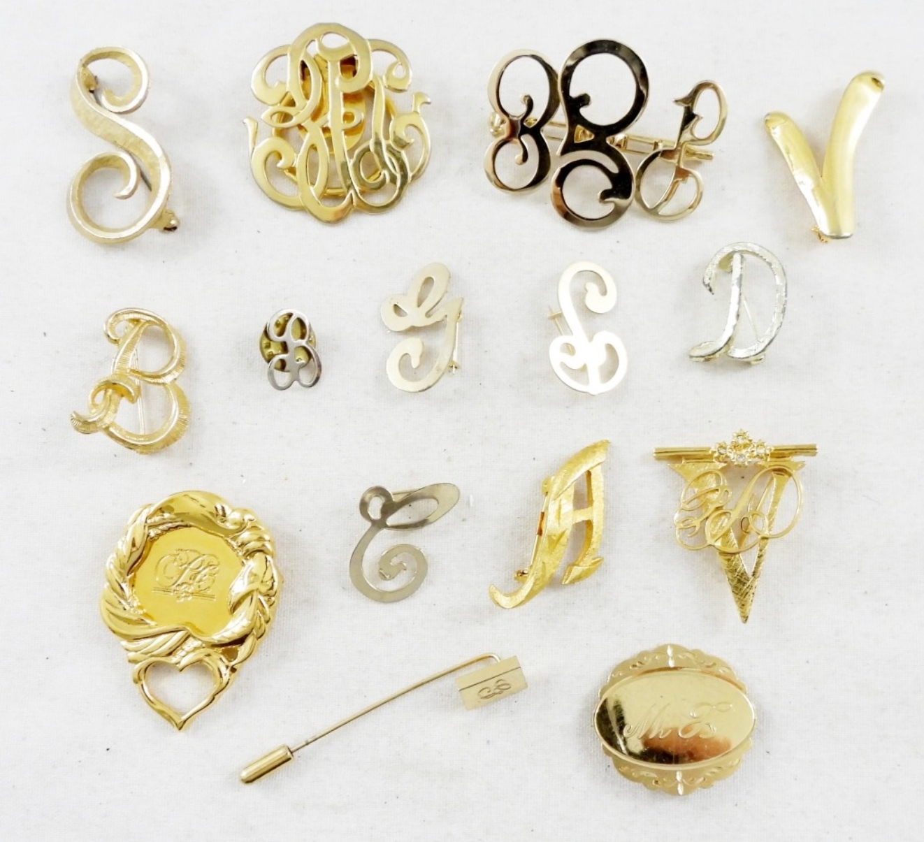 15 ASSORTED MONOGRAM AND LETTER BROOCHES, BID NOW!