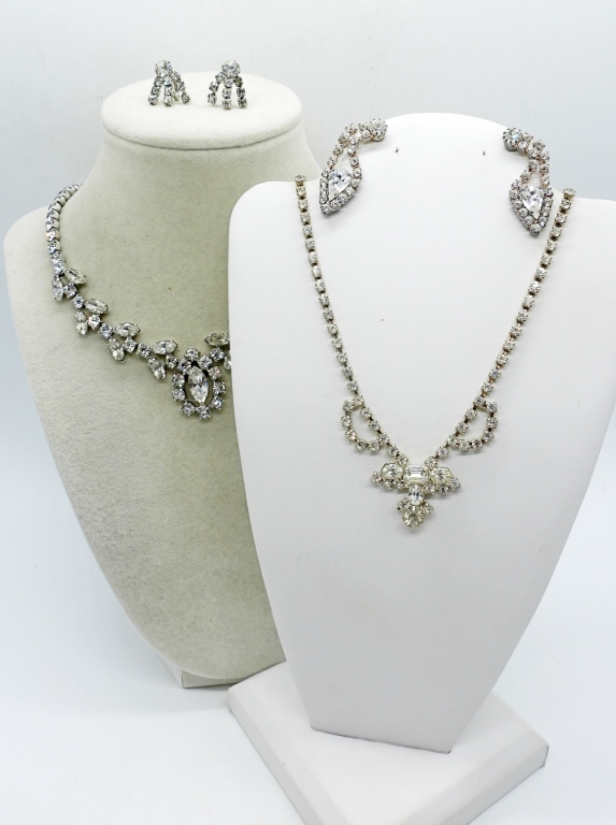 TWO VINTAGE WHITE RHINESTONE NECKLACES, 15″. TWO PAIR OF VTG WHITE RHINESTONE EARRINGS, CLIP ON & SCREW BACK.