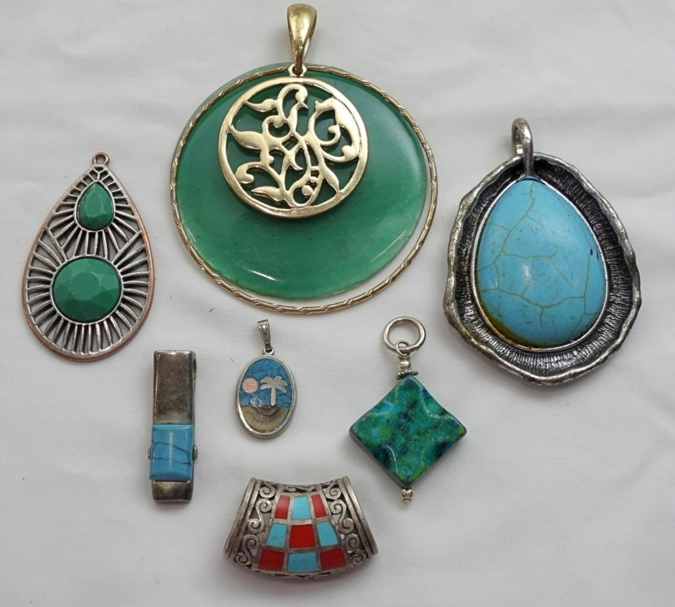 7 PRETTY TEAL WESTERN STYLE PENDANTS, SIZES RANKING FROM MEDIUM TO LARGE