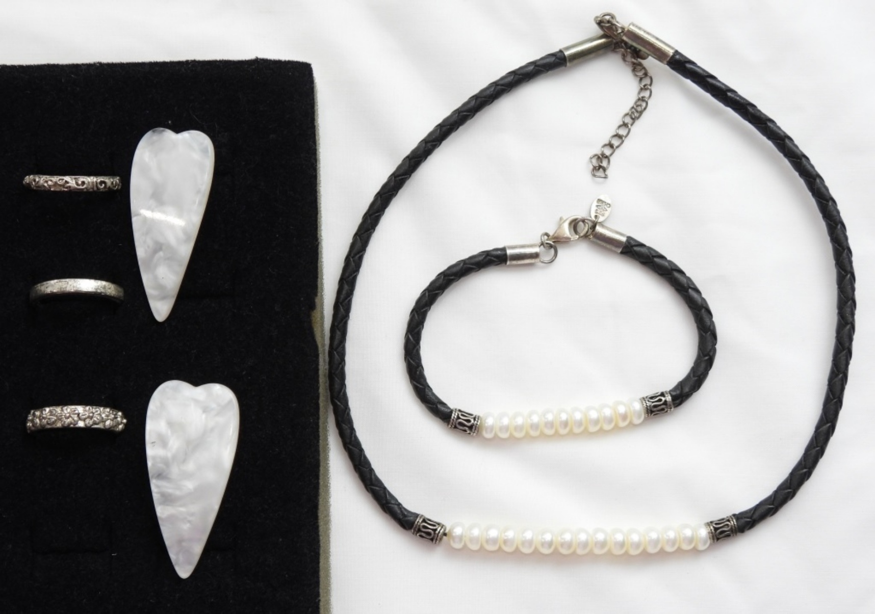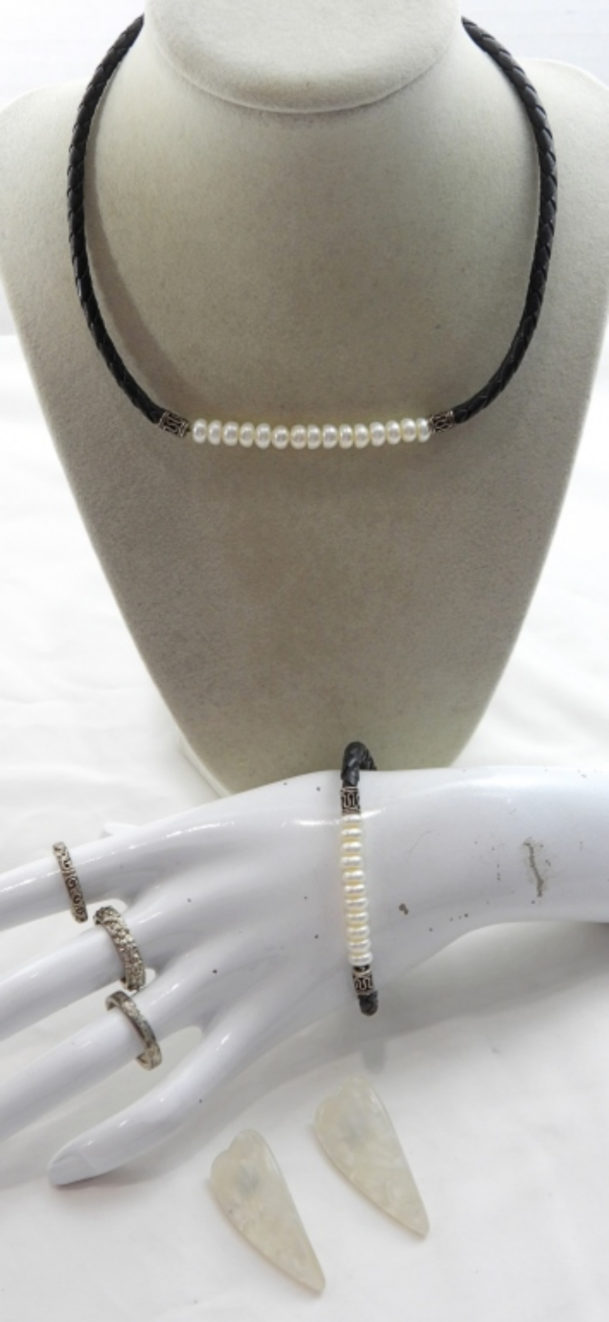 FAUX PEARL NECKLACE SET WITH 3 RINGS AND 1 SET OF EARRINGS