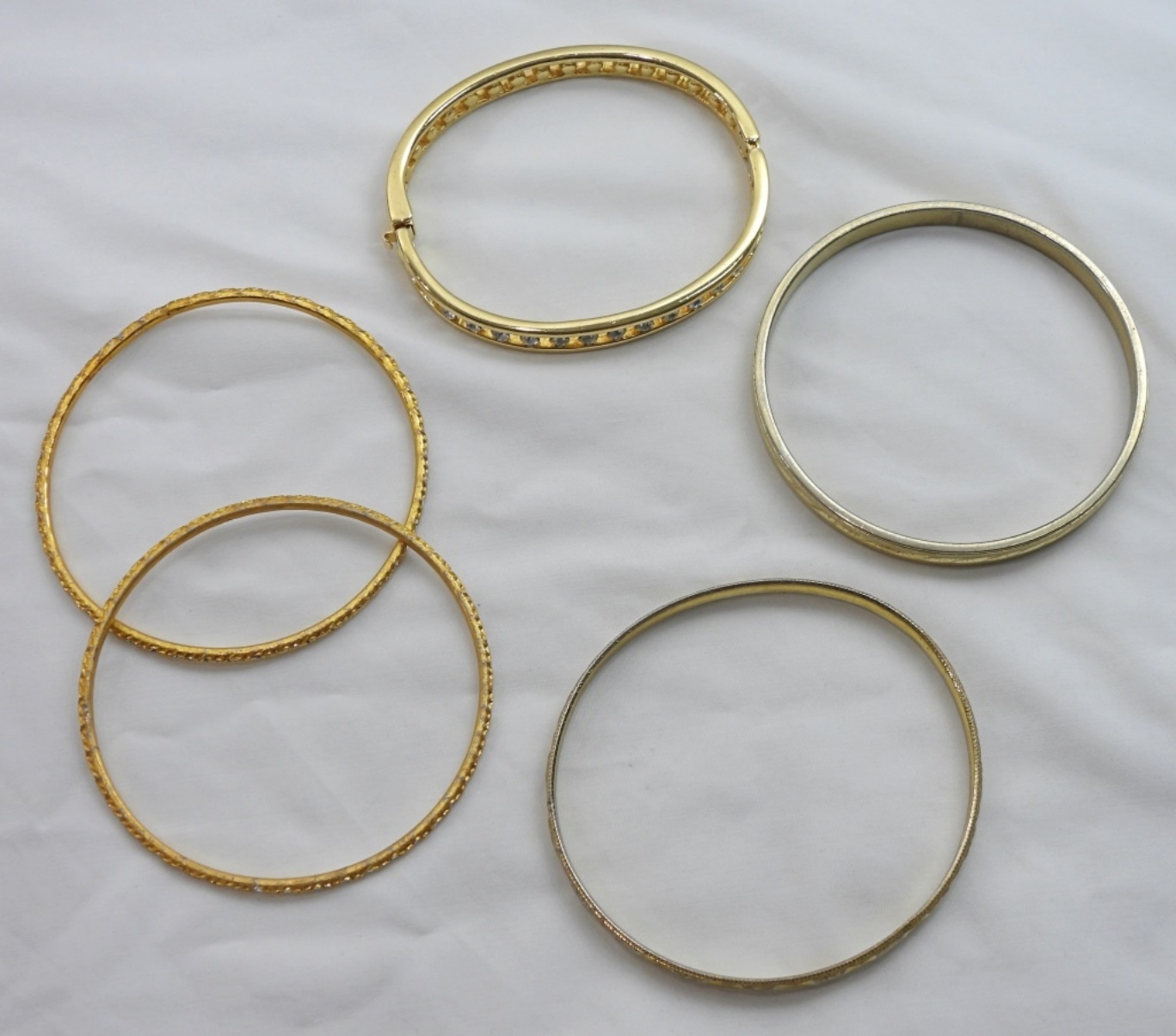 5 STUNNING GOLD TONED BRACELETS, VARIETY OF STYLES AND SIZES