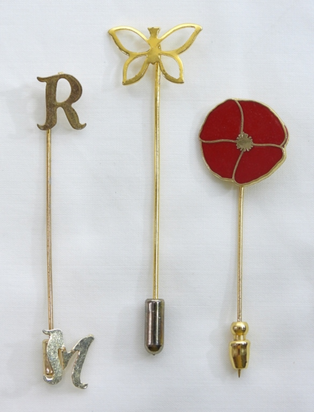 3 GOLD TONE DECORATIVE PINS, FLOWER, R, AND ROSE