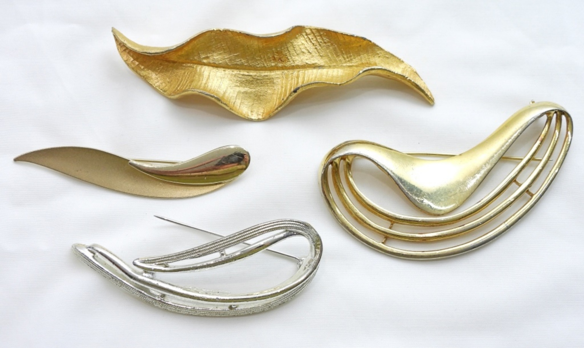 4 LARGE STUNNING DECORATIVE PINS, 1 FEATHER AND 3 VARIOUS STYLES