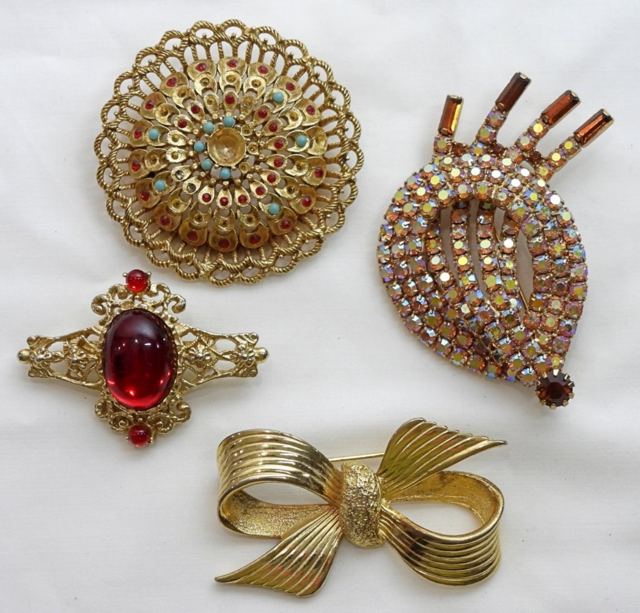 4 BEAUTIFUL SPARKLY MEDIUM SIZE PINS, VARIOUS SHAPES, STYLES AND COLORS