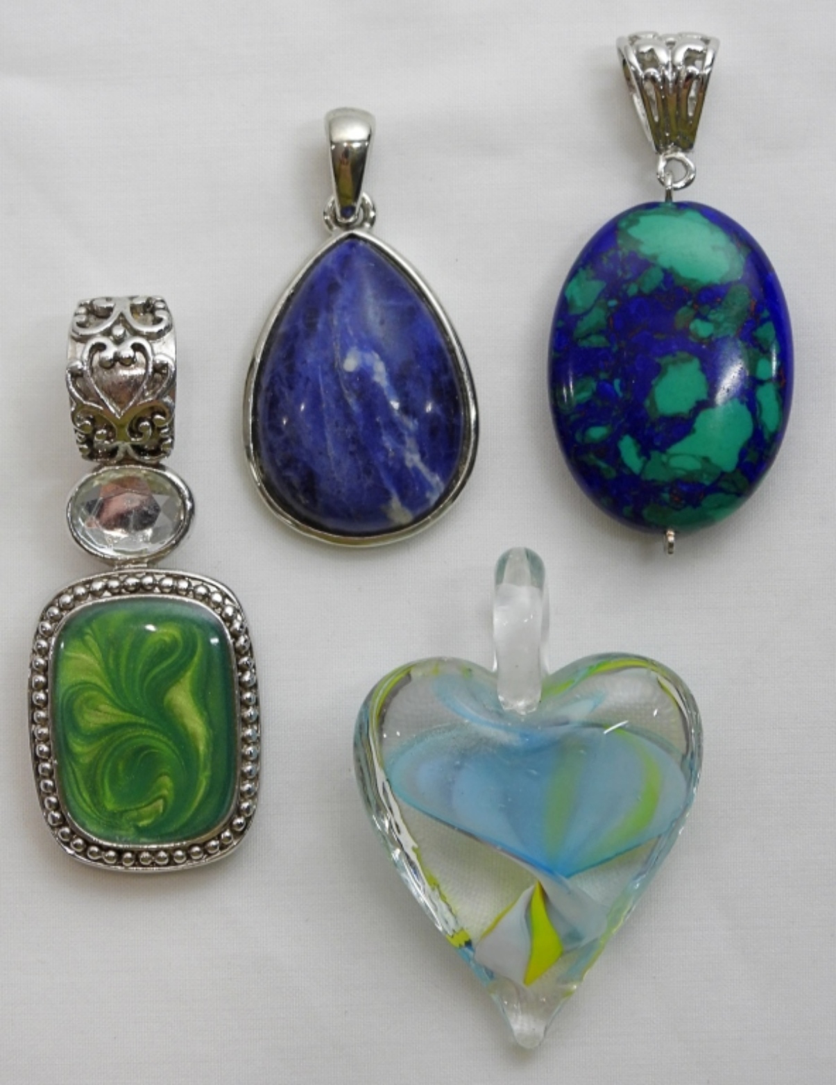4 PRETTY COLORFUL WOMENS PENDANTS, FAUX GEM STONES, BLUE, YELLOW, AND GREEN COLORED PENDANTS