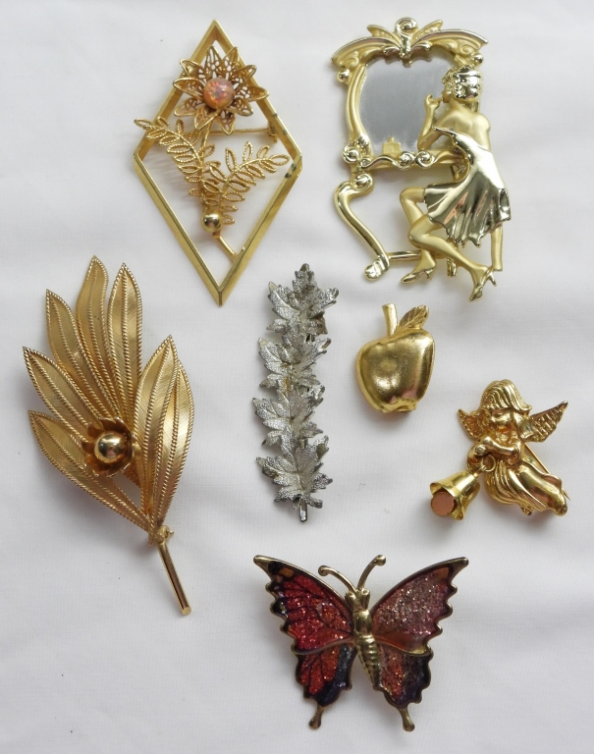 7 VARIETY GOLD TONED PINS, SOME MAY BE BROKEN OR UP FOR REPAIR