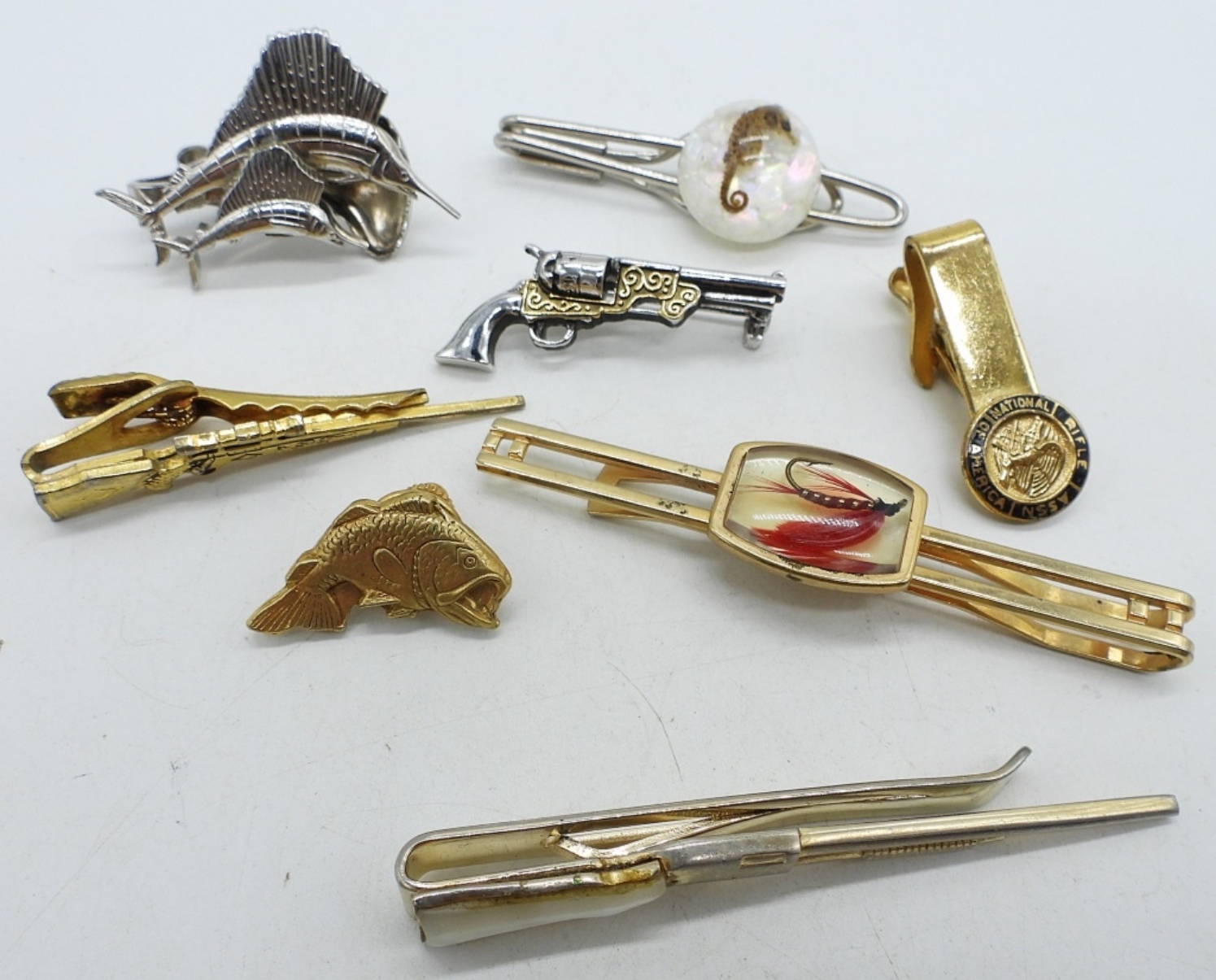 EIGHT GOLD AND SILVER TONE TIE ACCESSORIES. FISHING AND GUN DESIGNS