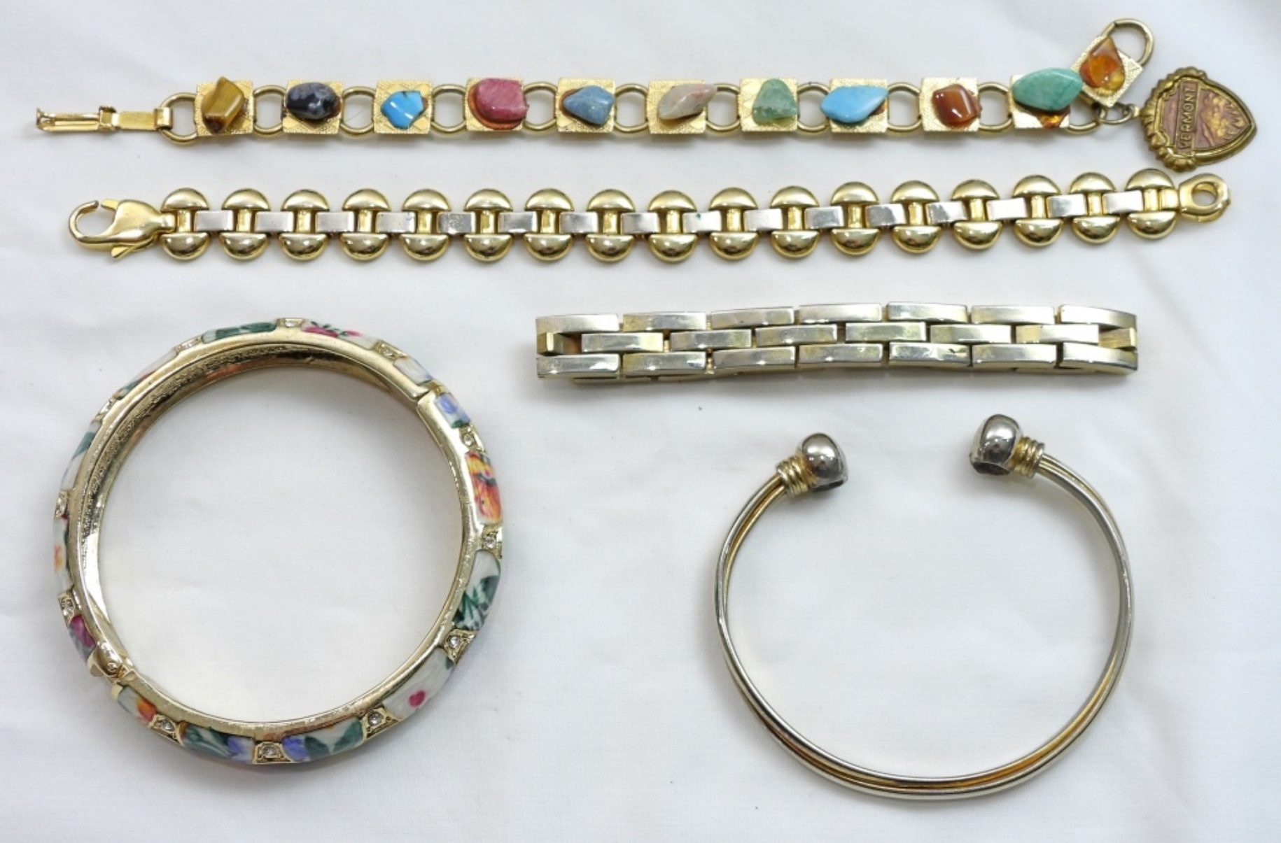(5) COLORFUL FUN DESIGNED BRACELETS, STYLES FROM SLIP ON TO BUCKLE, MANY DIFFERENT DESIGNS