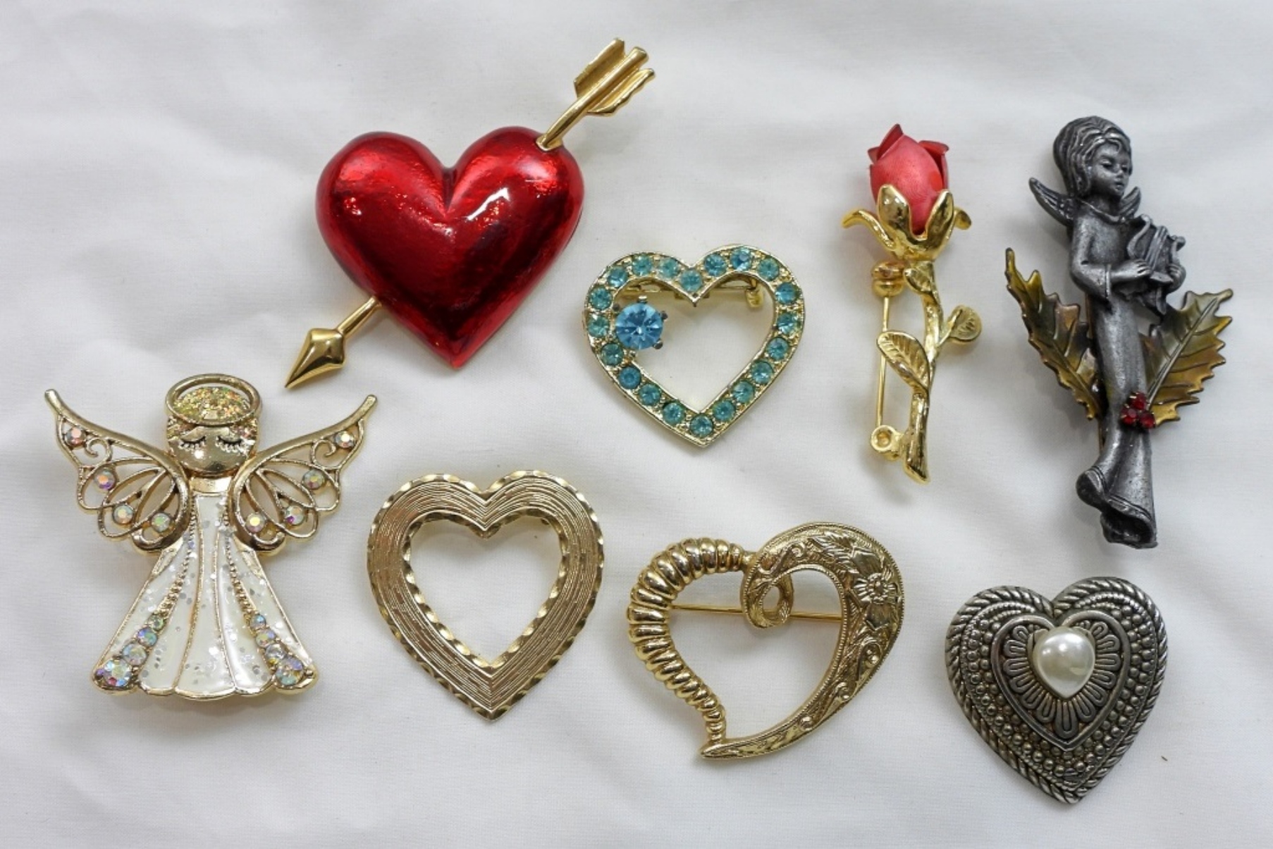 (8) BEAUTIFUL FASHION PINS- HEARTS, FLOWERS, AND ANGELS