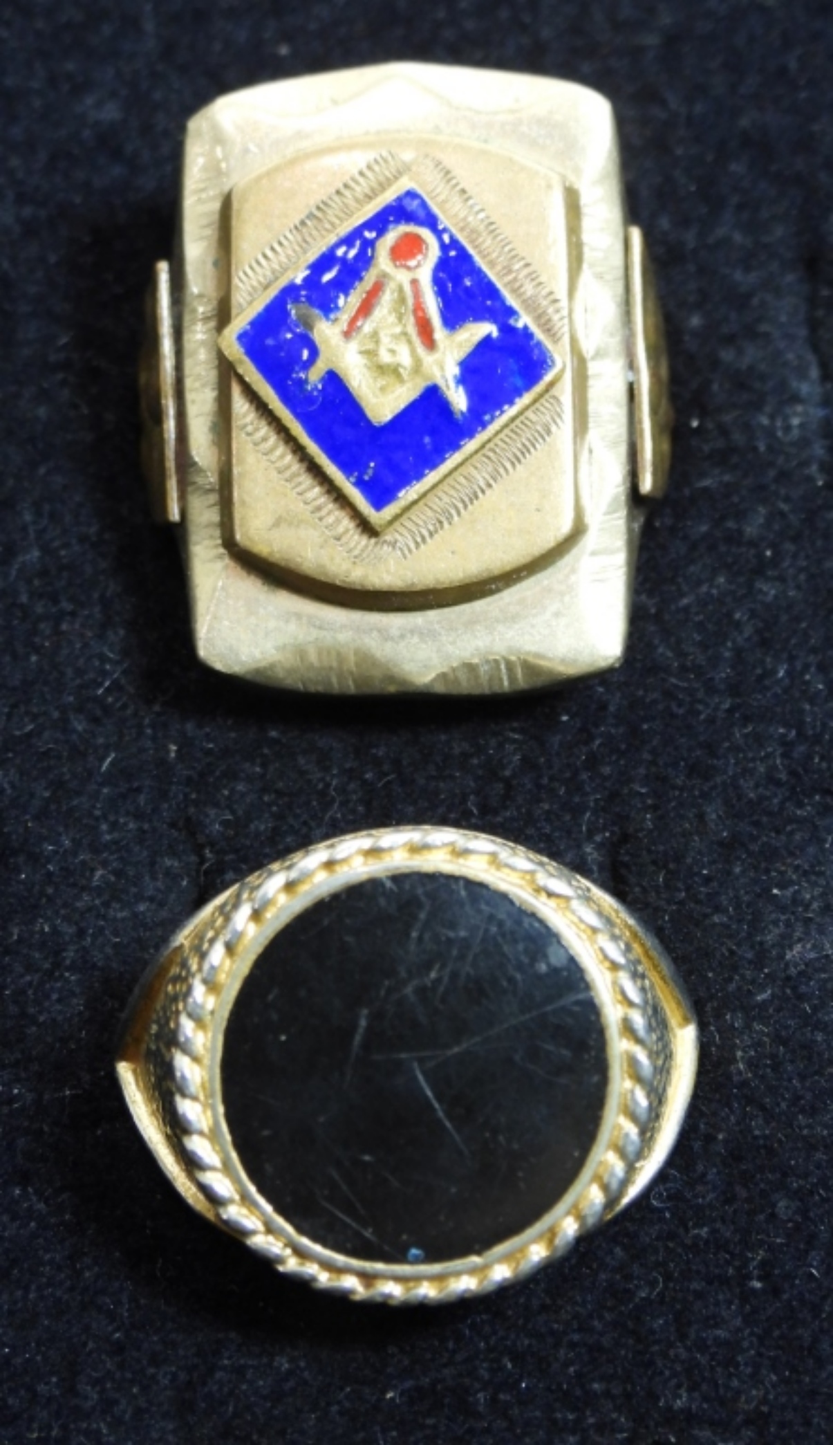 2 PRETTY GOLD TONED RINGS, ONE BLACK TONED FACE AND THE OTHER BLUE AND RED DESIGN