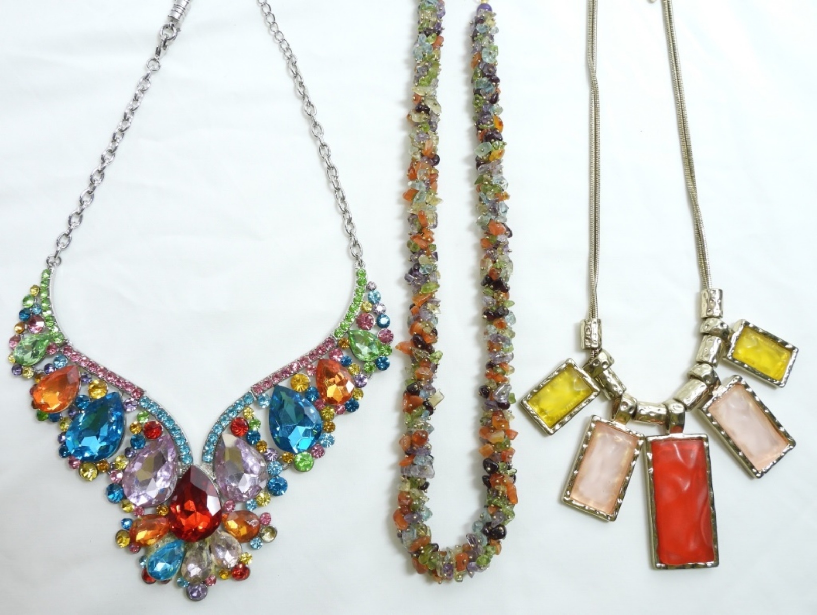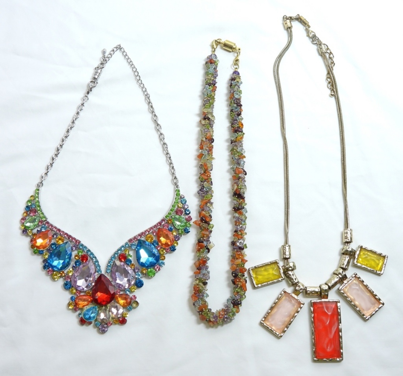3 VARIETY STYLE COLORFUL SPARKLY NECKLACES, SOME GLUE RESIDUE ON LARGE SPARKLY FAUX GEM STONE PENDANT