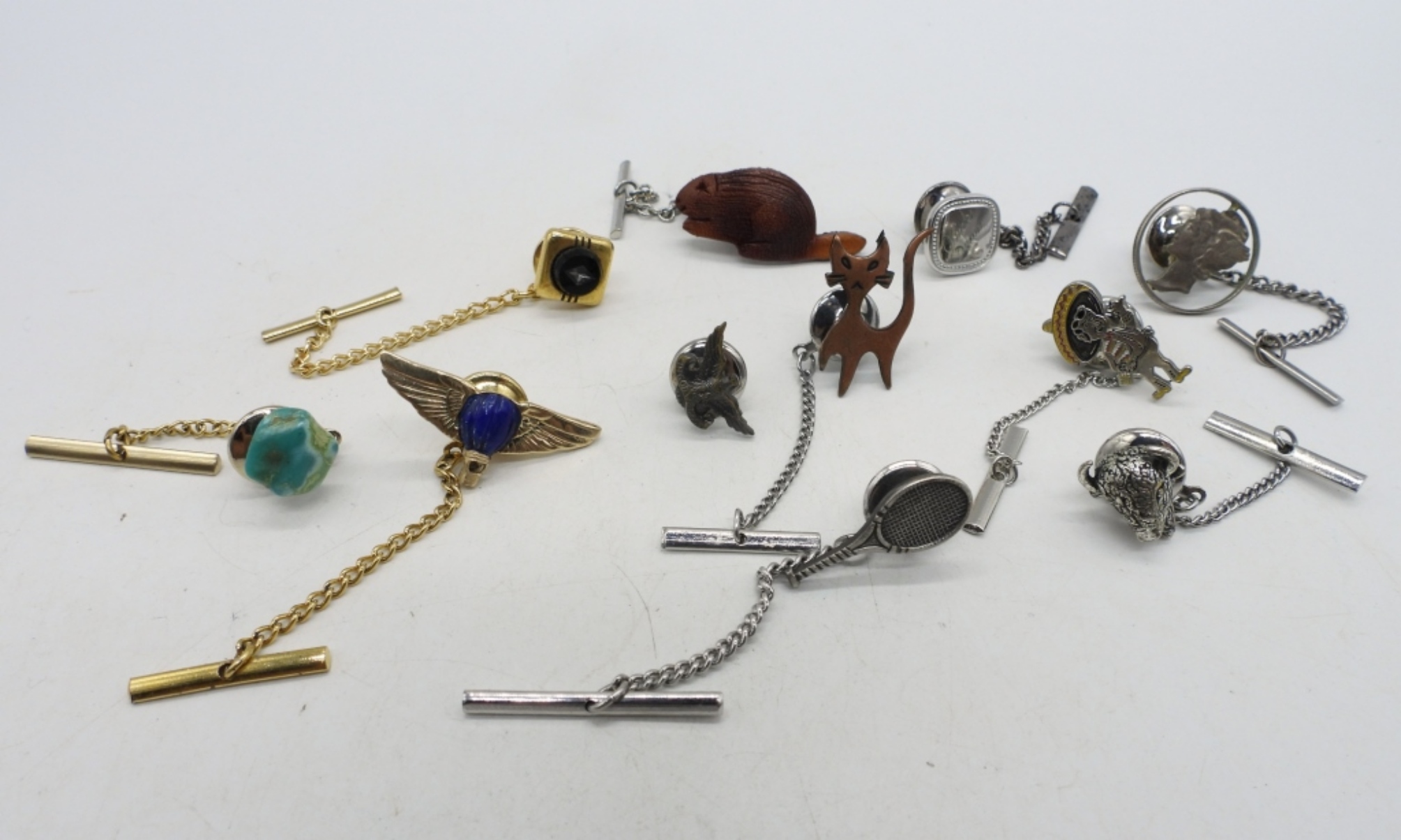 ELEVEN VINTAGE GOLD AND SILVER TONE TIE TACKS. PLEASE SEE PHOTOS