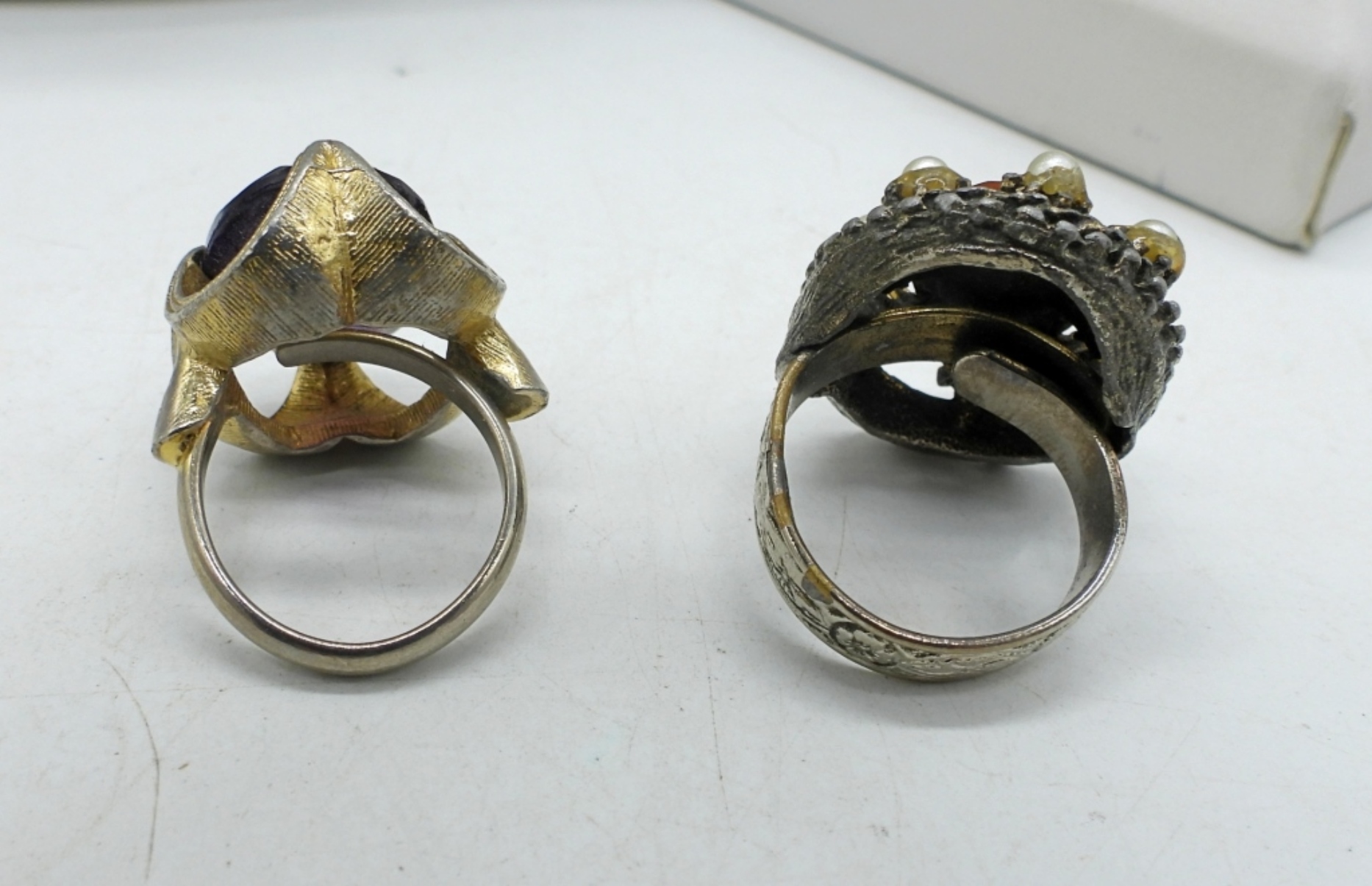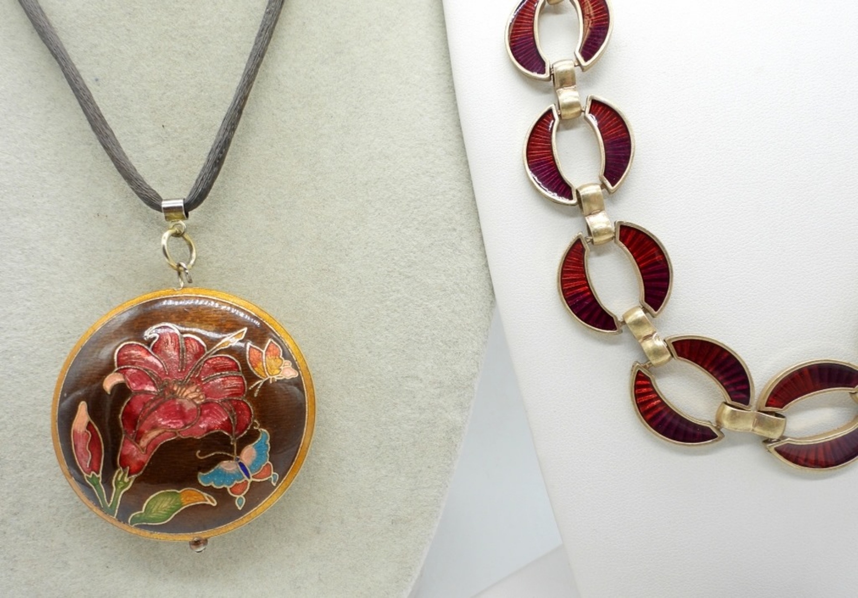 CLOISONNE PENDANT ON A 24″ CORD. TWO RINGS, BOTH ADJUSTABLE. VINTAGE GOLD TONE / RED NECKLACE 18″.