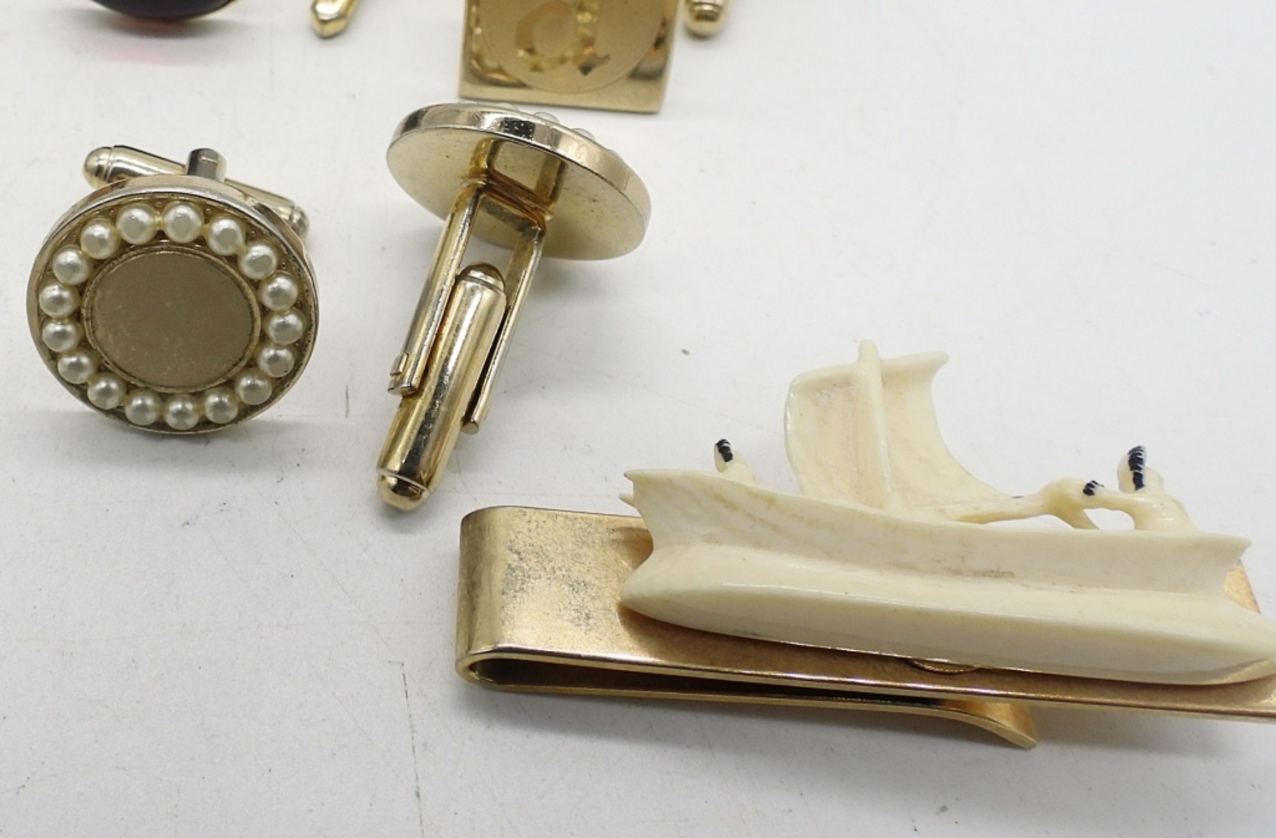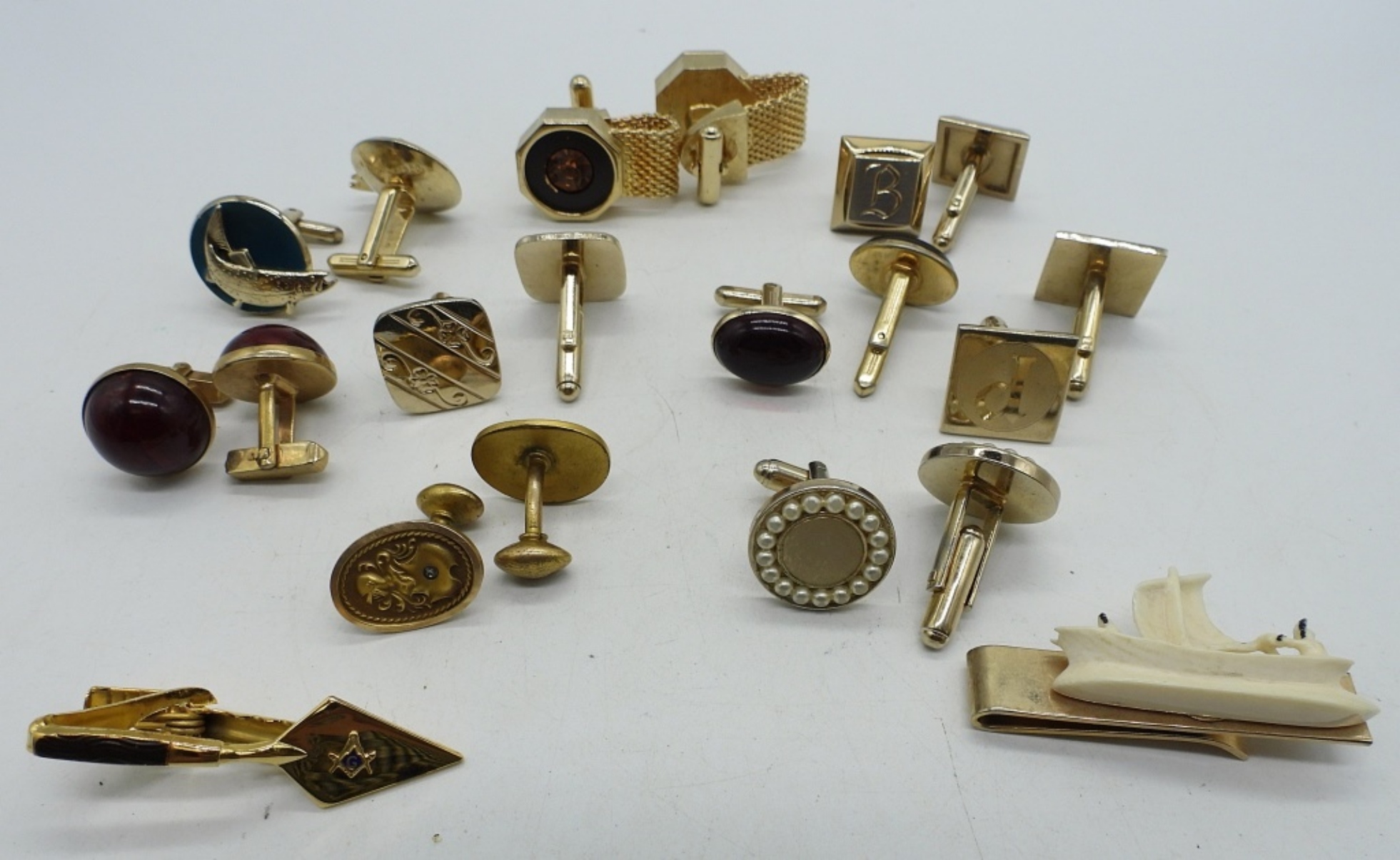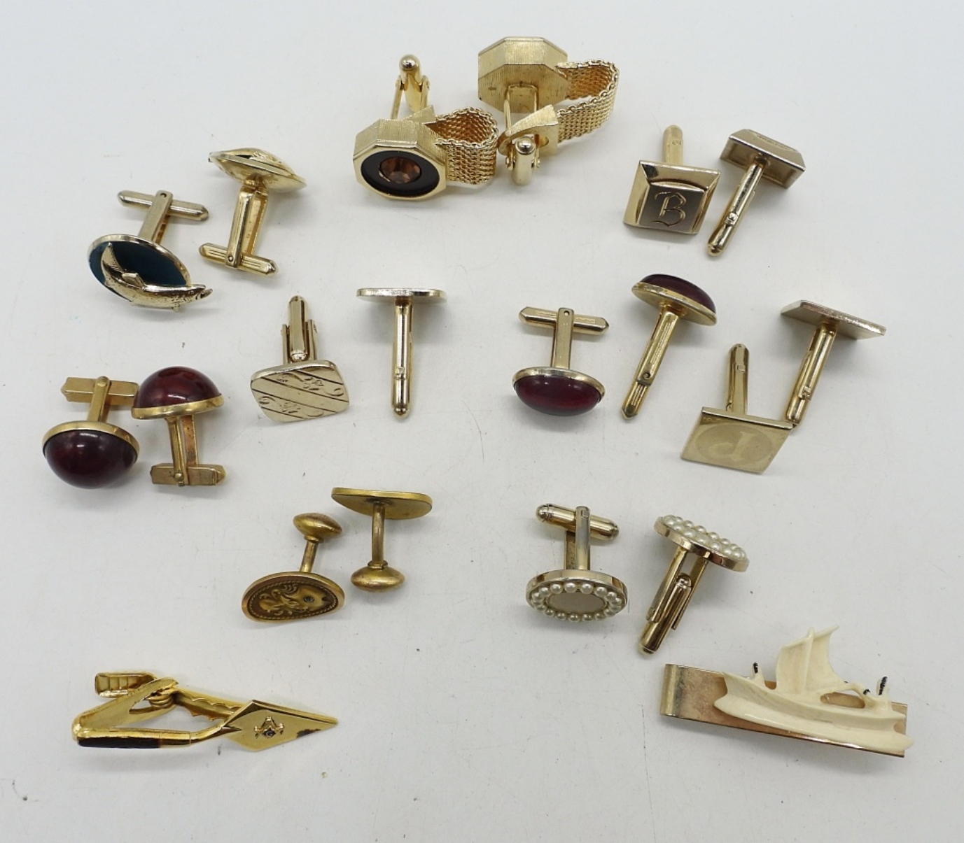 9 MATCHING PAIR OF VINTAGE CUFFLINKS. TWO VINTAGE TIE CLIPS