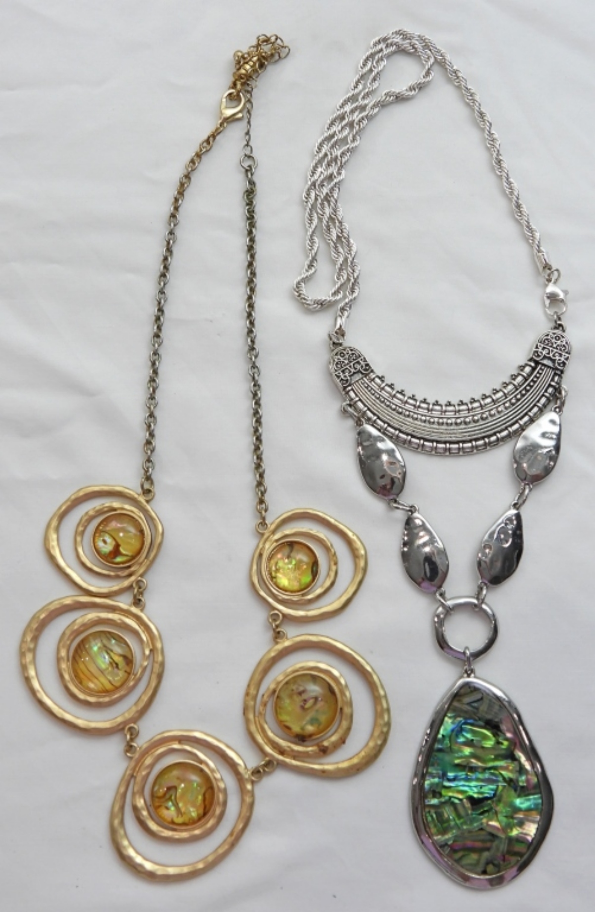 2 LARGE UNIQUE WOMEN’S NECKLACES, GOLD TONE LARGE DECORATIVE PENDANT NECKLACE, SILVER TONE LARGE DECORATIVE PENDANT NECKLACE