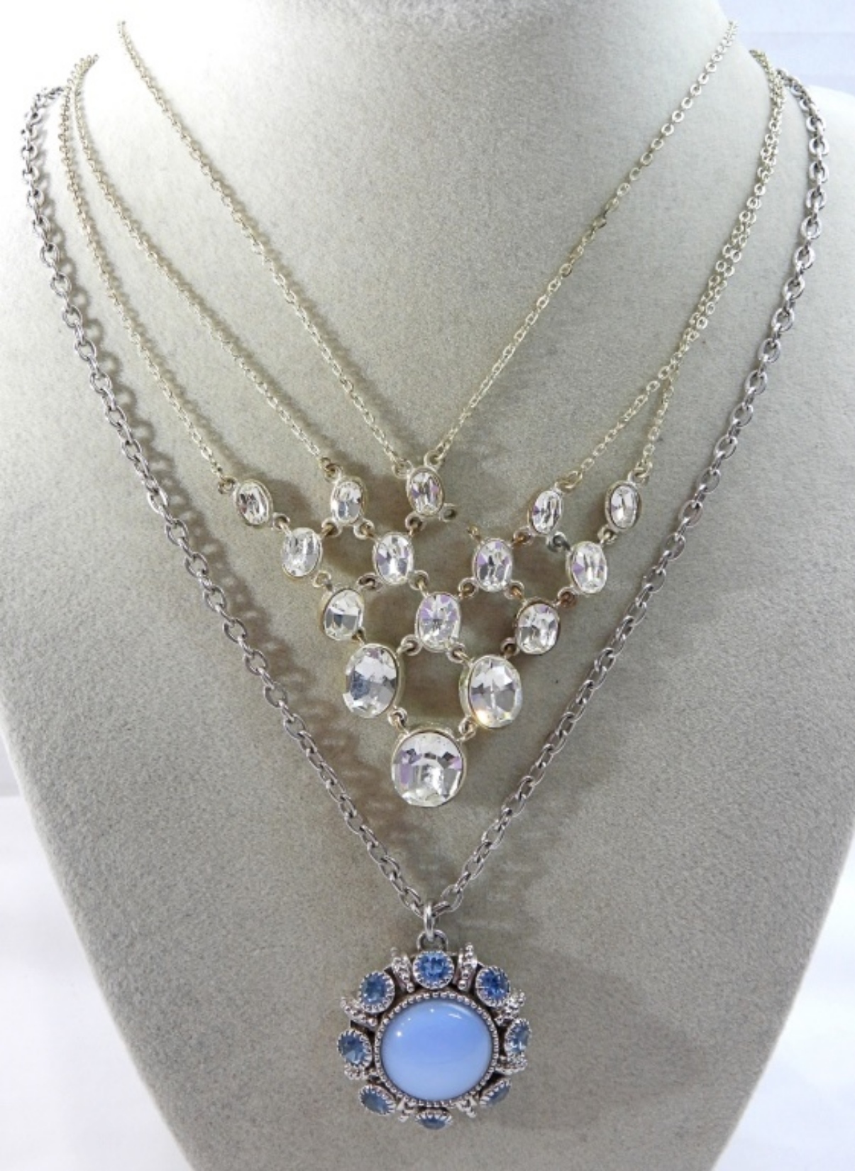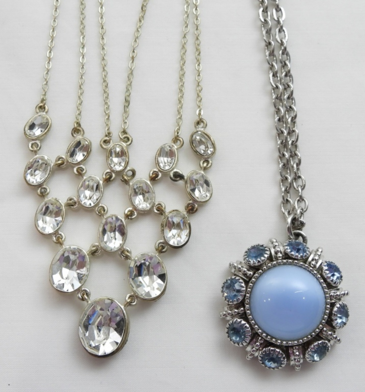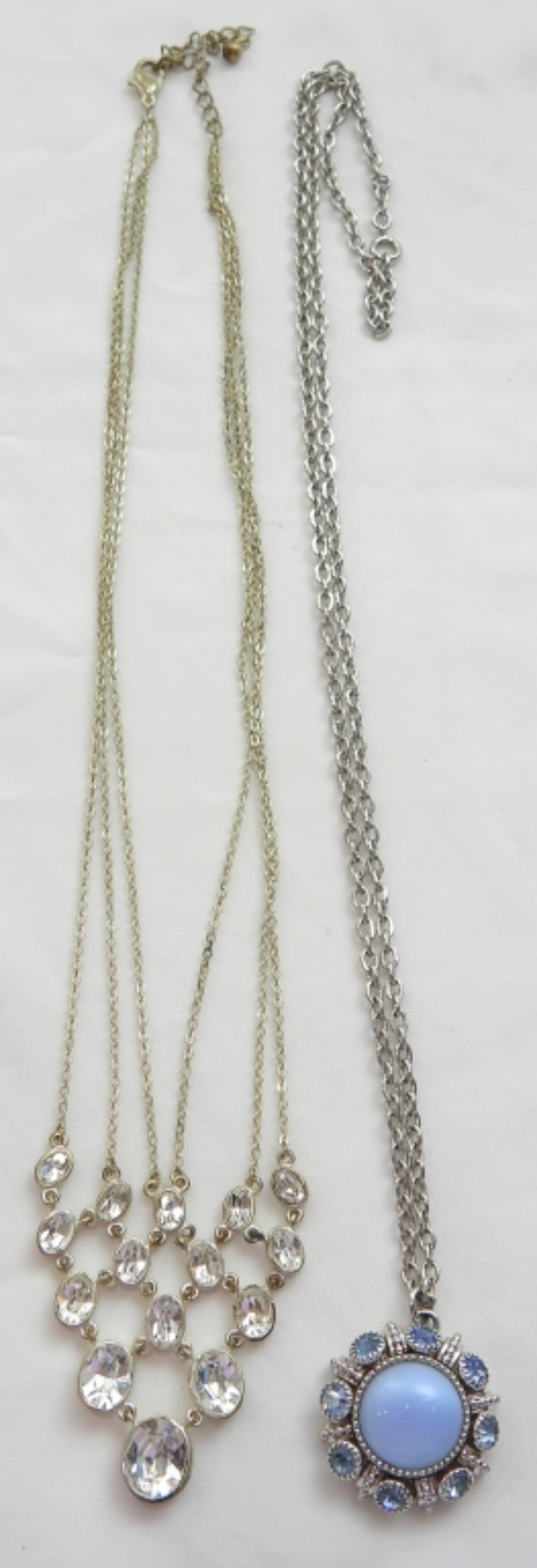 2 BEAUTIFUL SPARKLY WOMEN’S NECKLACES, ONE WITH A BABY BLUE SPARKLY PENDANT, THE OTHER WITH A DANGLE FAUX CLEAR GEM STONE PENDANT