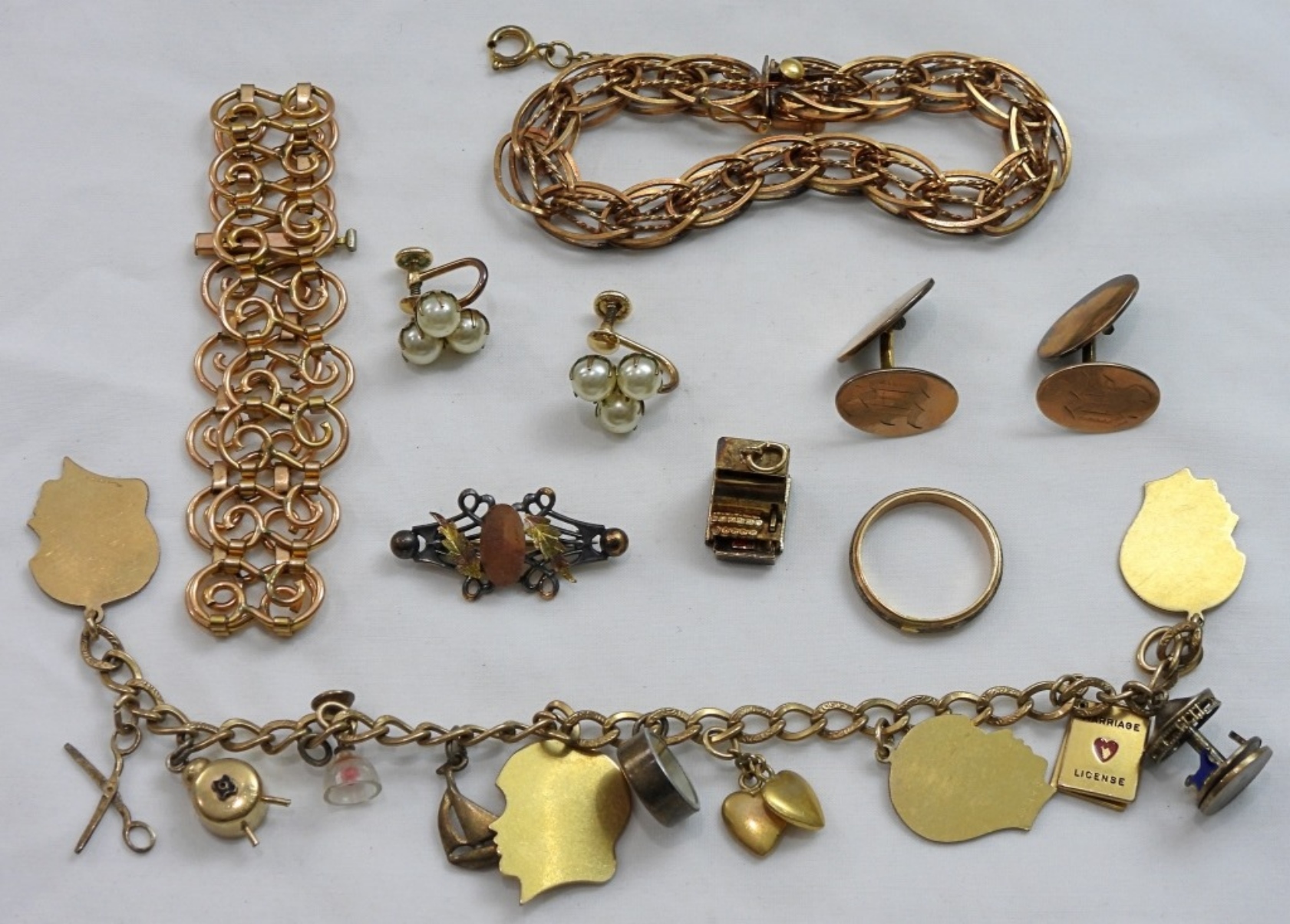 VINTAGE/ANTIQUE GOLD FILLED LOT, SOME MARKED- BRACELETS, CHARMS, RINGS, AND MORE