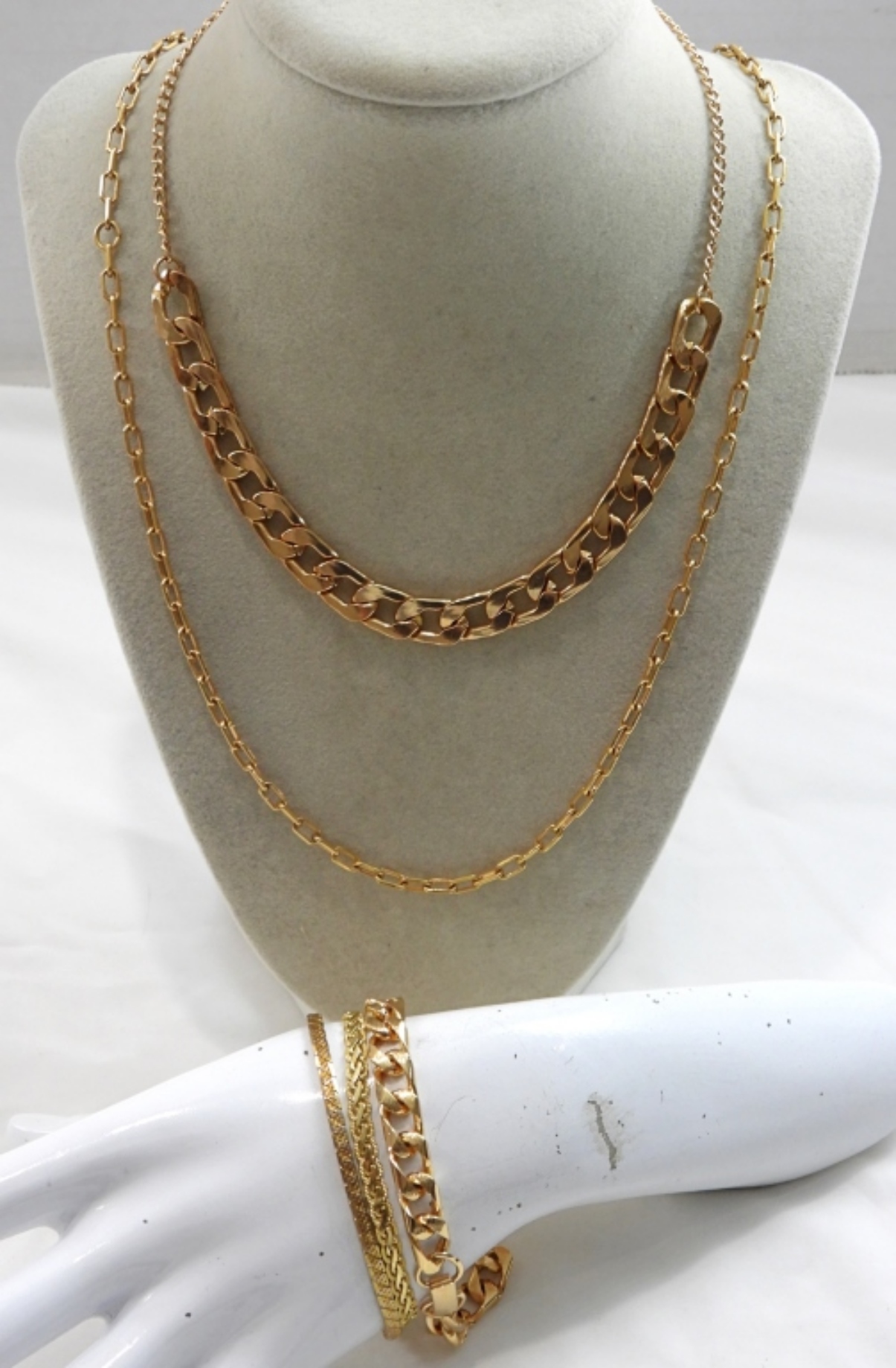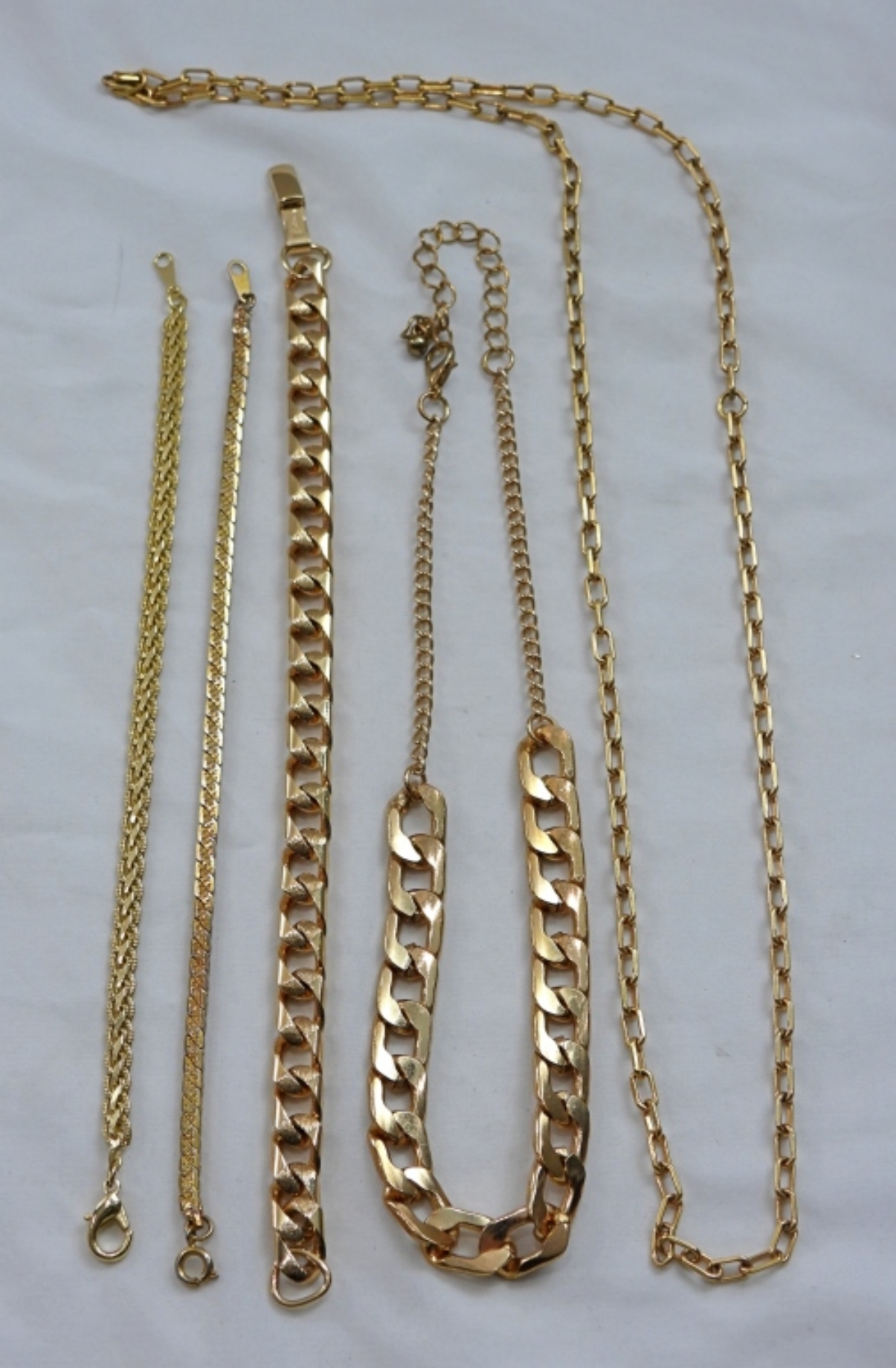 (5) PC. UNIQUE GOLD TONE CHAIN LOT- 3 NECKLACES AND 2 BRACELETS