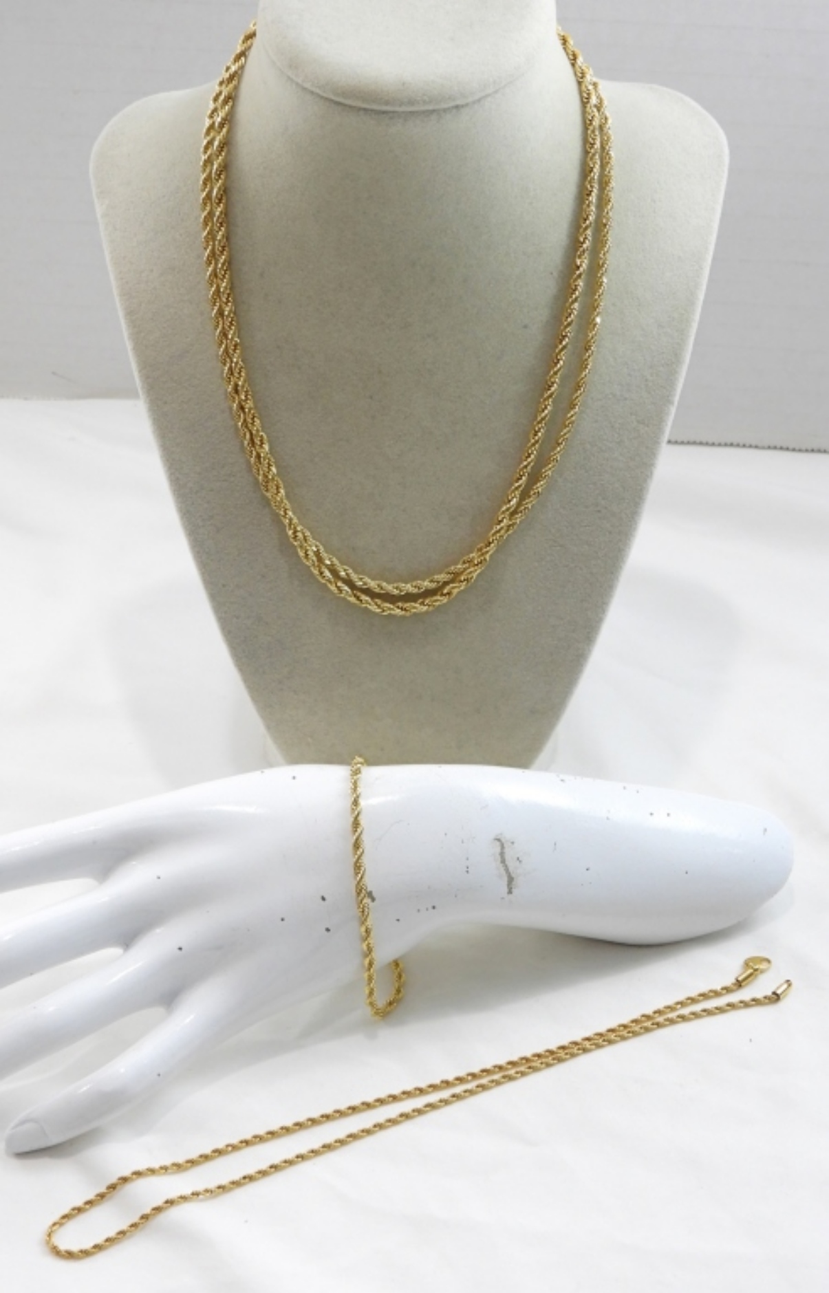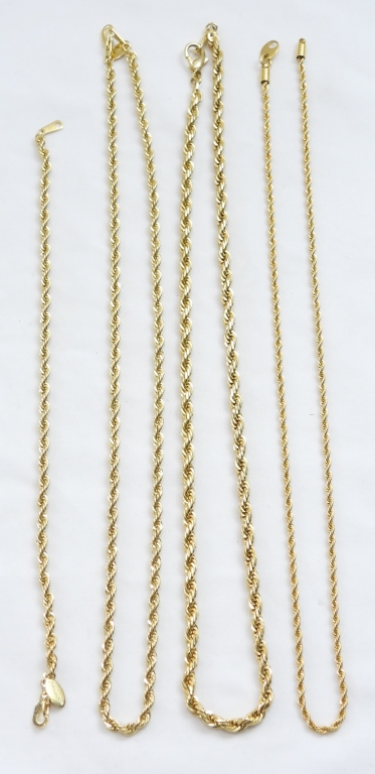 GOLD TONE ROPE CHAIN JEWELRY LOT- 2 NECKLACES AND 3 BRACELETS, ONE NECKLACE NEED CLASP REPAIRED