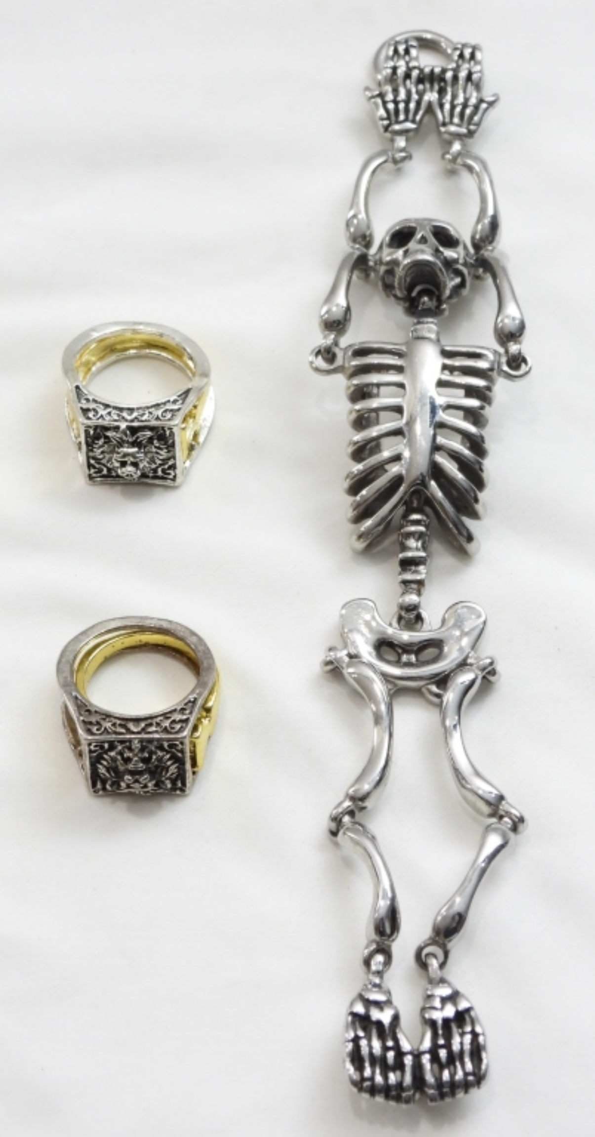 SPOOKY VINTAGE FASHION JEWELRY LOT- 3 RINGS AND 1 SKELETON BRACELET