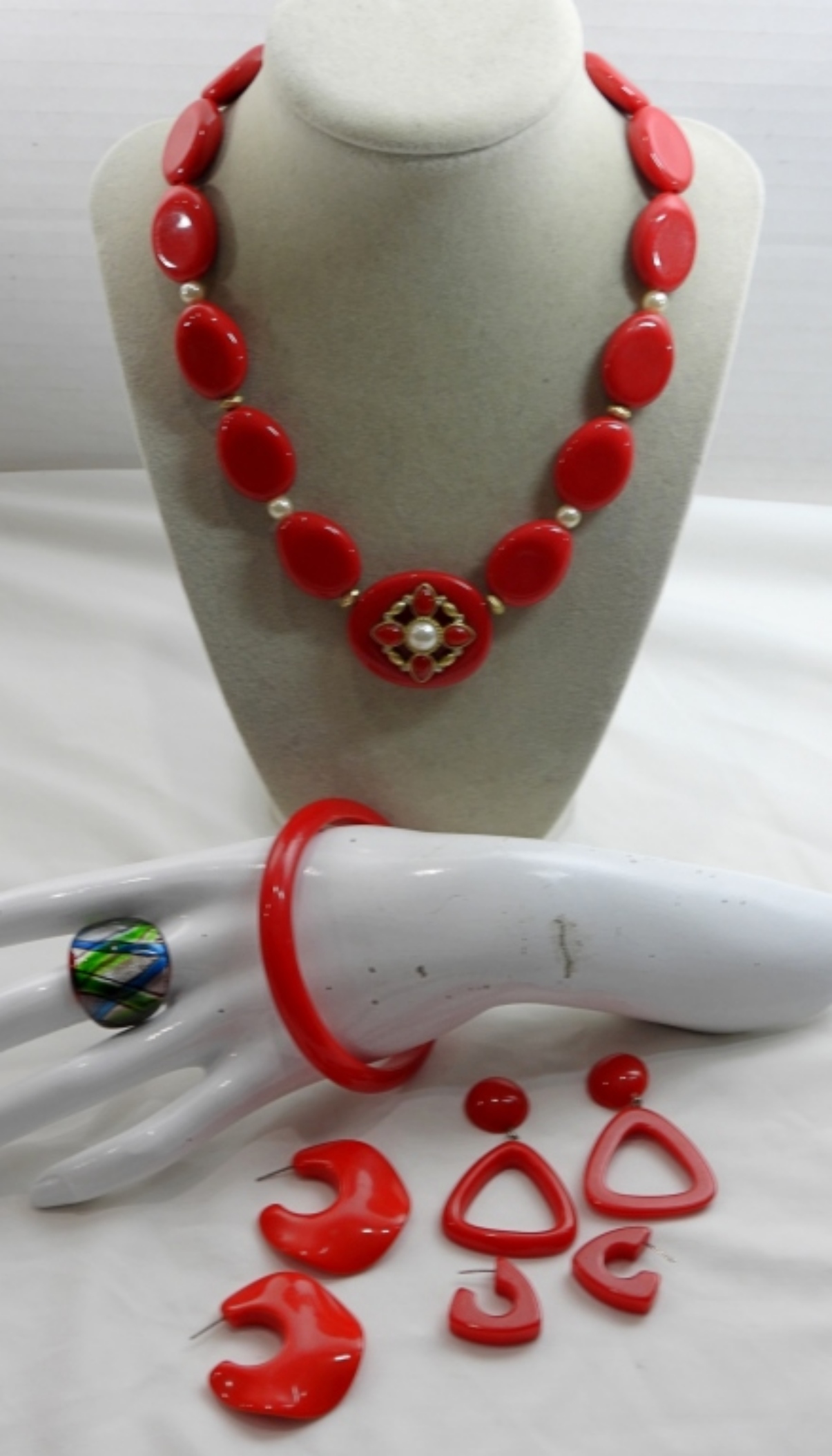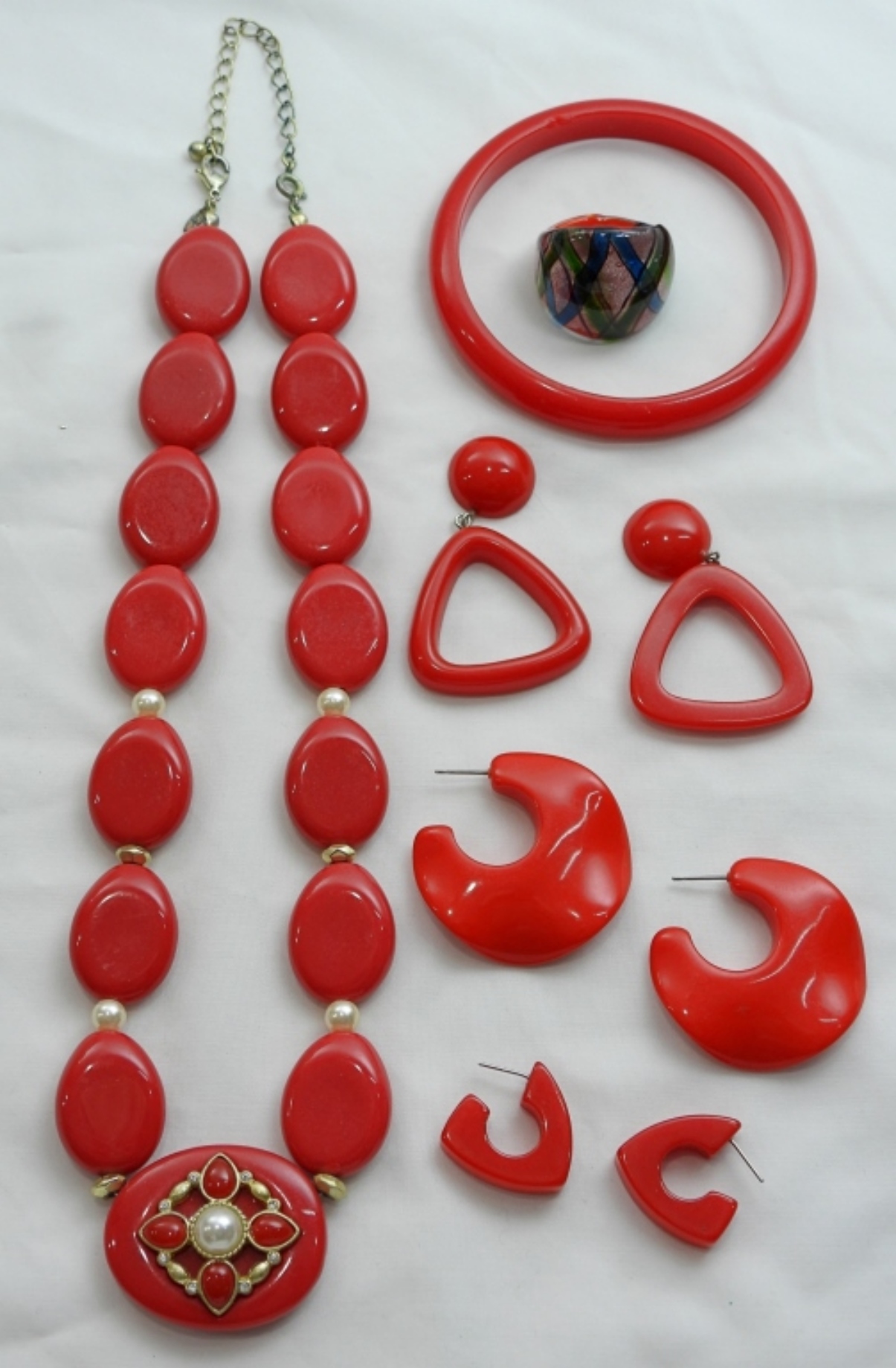 16″ NECKLACE, BANGLE BRACELET (3) EARRING SETS with one needing repair & GLASS RING SIZE 8