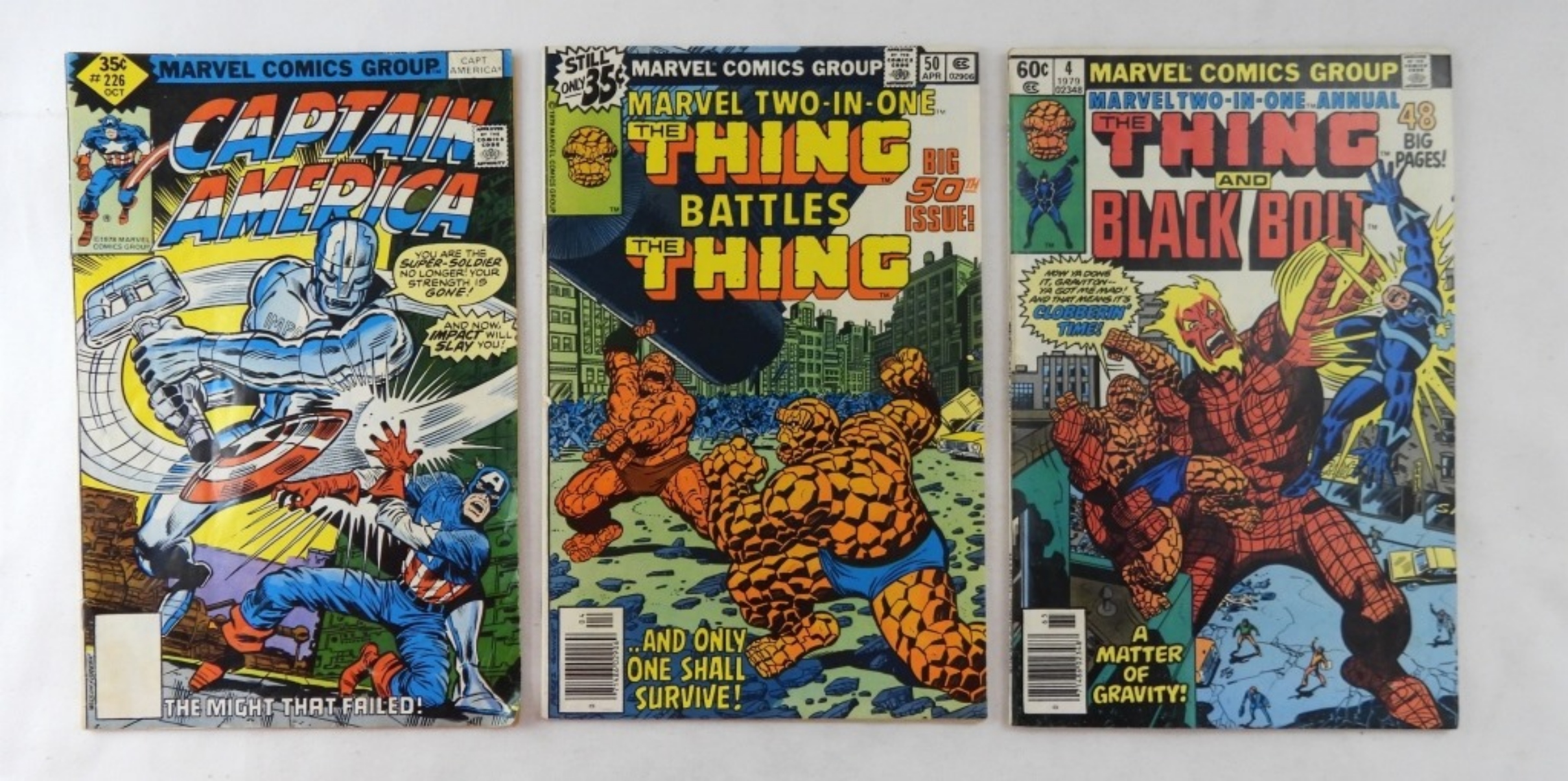 BRONZE AGE MARVEL COMIC- THE THING AND THE BLACK BOLT VOL 1, NO. 4 1979- IN GOOD CONDITION SHOWS SOME WEAR. THE THING BATTLES THE THING VOL. 1, NO. 50, APRIL 1979- IN GOOD CONDITION SHOWS SOME WEAR. CAPTAIN AMERICA