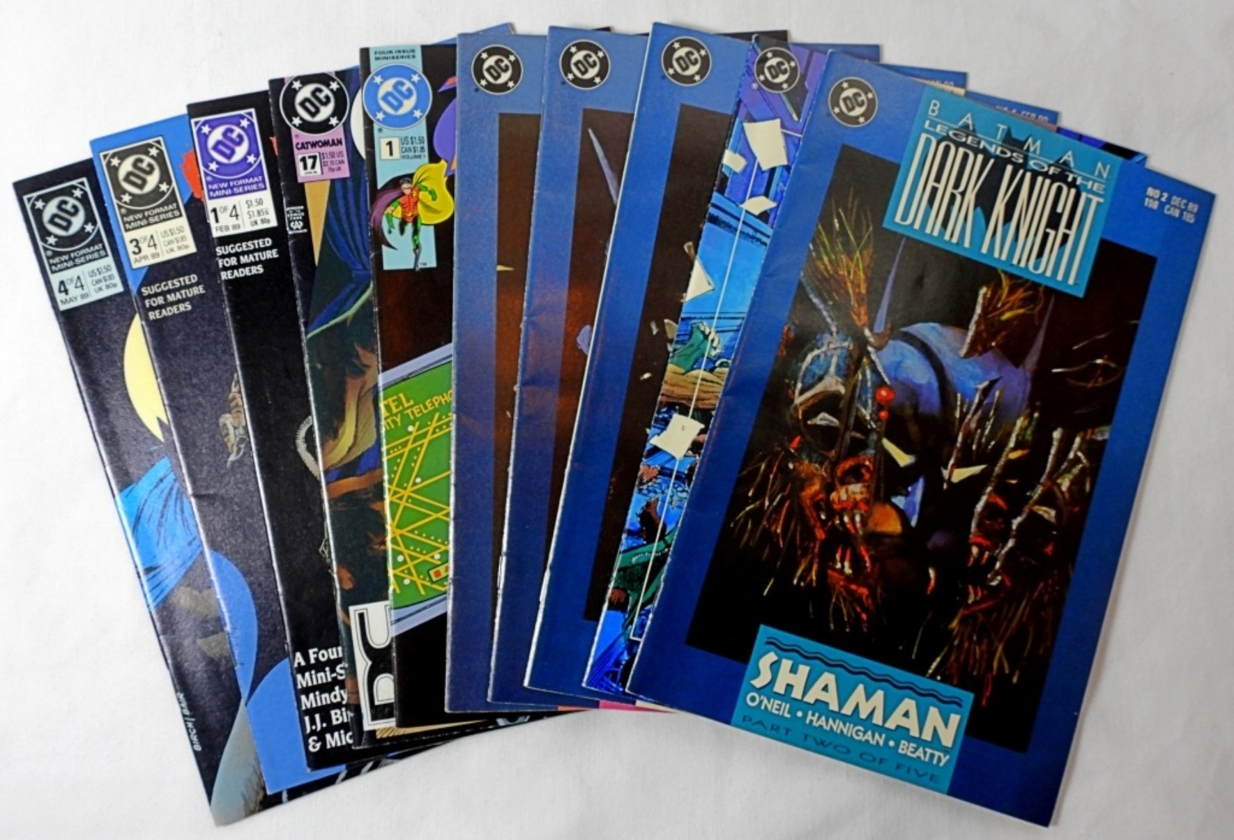 10-DC ASSORTED COMICS- 1989-1995- CATWOMAN- 1989-NO. 1,3,4 OF 4 & 17. BATMAN LEGENDS OF THE DARK KNIGHT-1989- NO. 2, 10, 4, 3, 5. ROBIN II THE JOKER’S WILD-1991- NO. 1. ALL OF THESE COMICS DO SHOW WEAR, PREOWNED.