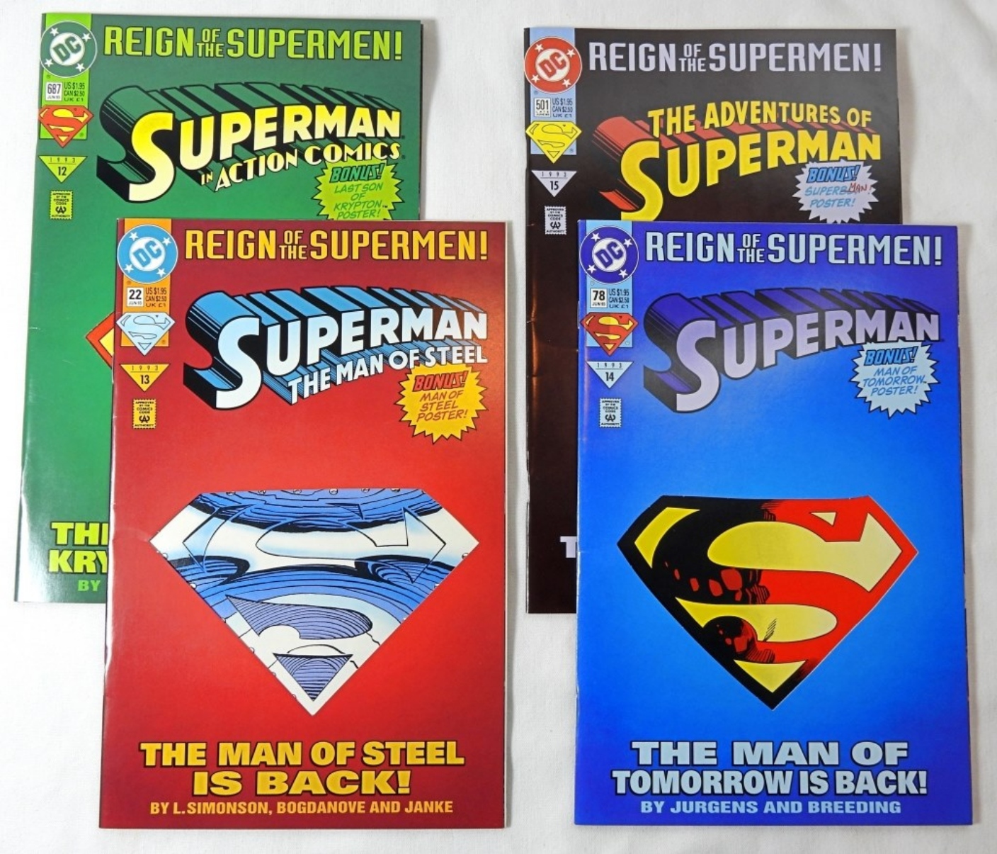 8- DC COMICS-1993-1997- SUPERMAN- 1993-1993-1997-NO. 778, 22, 501, 687, 500, 733, 123. BATMAN & SPIDER-MAN- 1997. ALL OF THESE COMICS ARE IN GOOD CONDITION. THEY DO SHOW WEAR, PREOWNED.