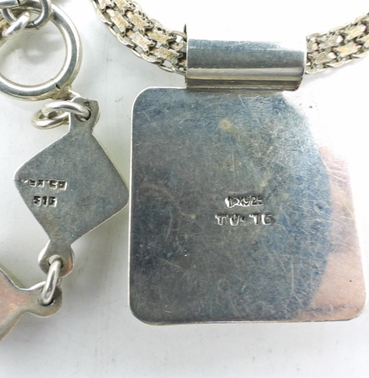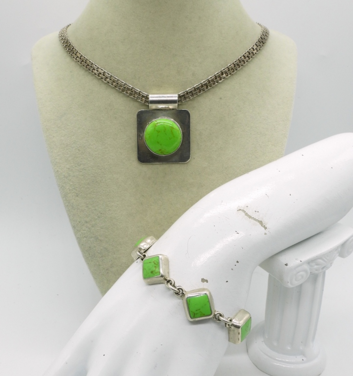 TAXCO MEXICO STERLING GREEN TURQUOISE PENDANT & BRACELET. 20″ STERLING CHAIN. PENDANT IS MARKED “TO-76″ HARD TO READ, BRACELET MARKING NOT LEGIBLE. SEE PHOTOS. BRACELET 7″, PENDANT 1.5”. (38 DWT)