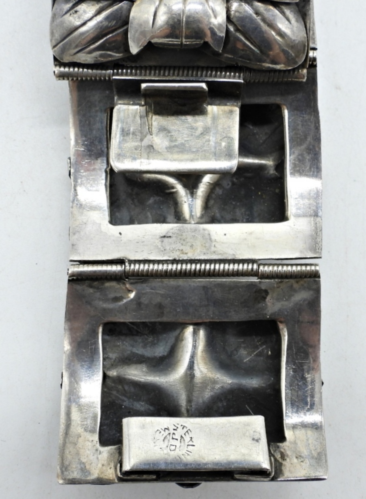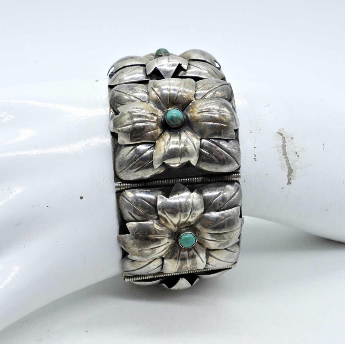 7″ LONG STERLING BRACELET WITH TINY TURQUOISE GEMSTONES. 1.5″ WIDE. MADE IN MEXICO – VINTAGE (47.7 DWT)