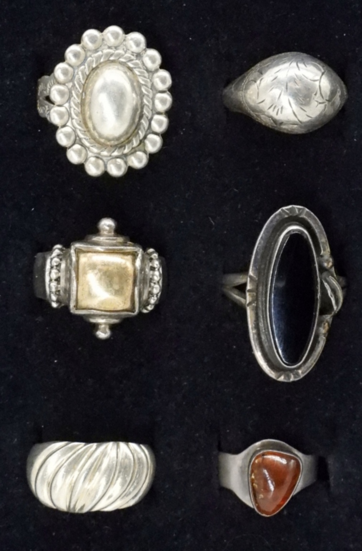 SIX STERLING VINTAGE FASHION RINGS. SIZES 5-9 & AN ADJUSTABLE ONE. (20 DWT)