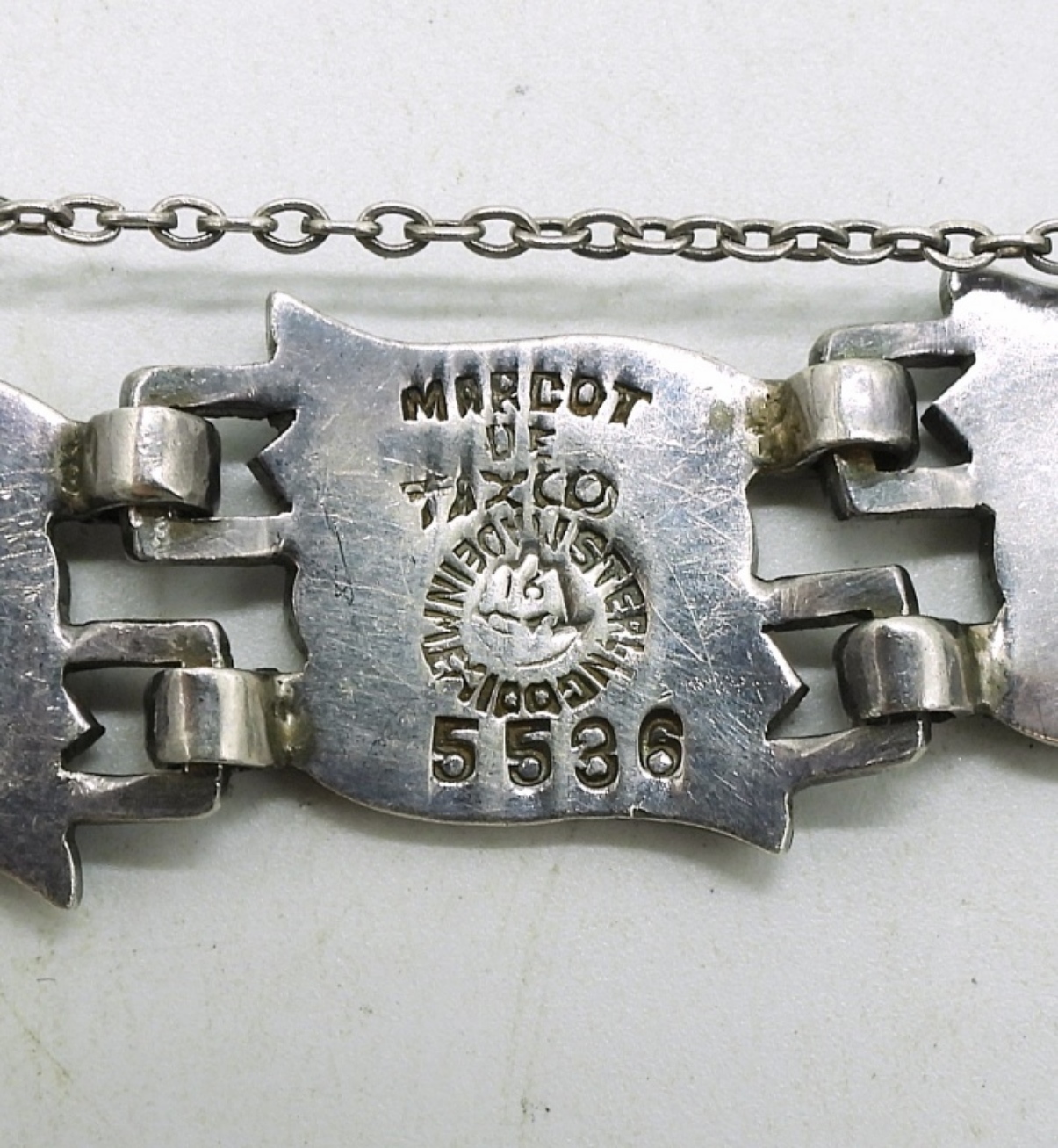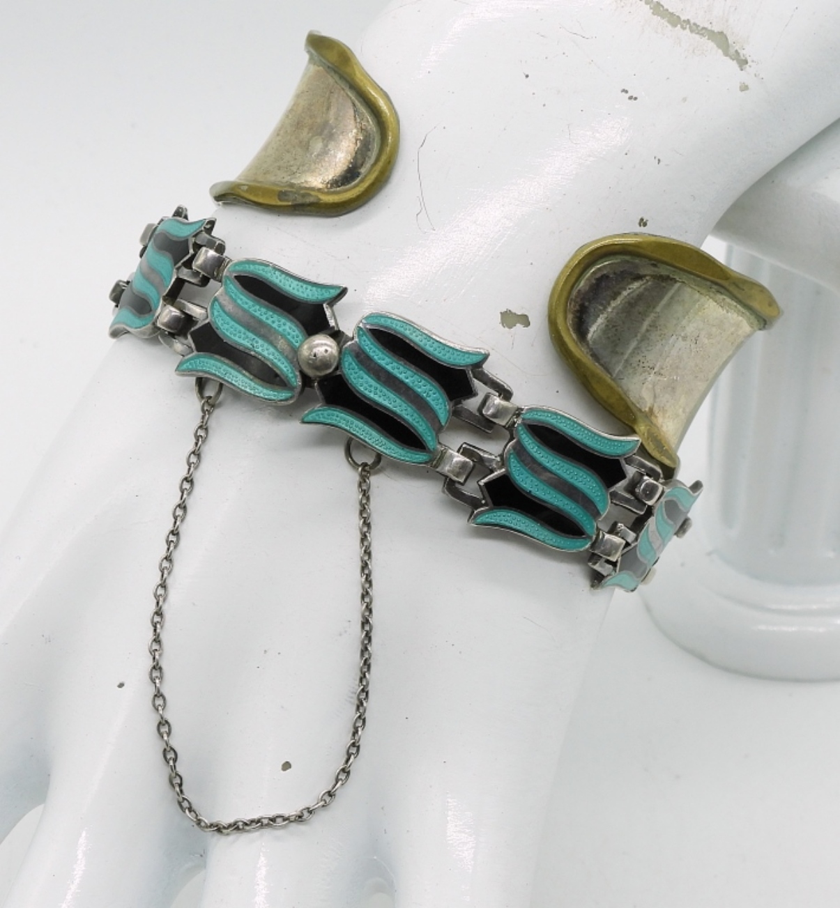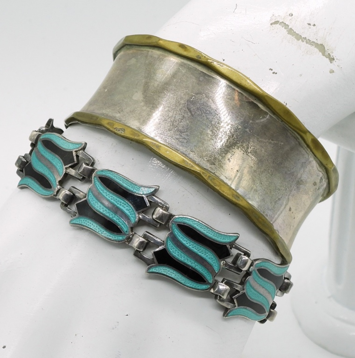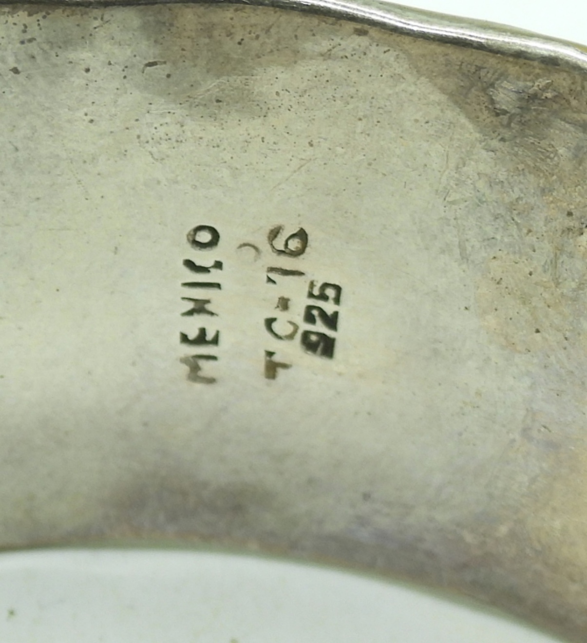 TWO STERLING TAXCO BRACELETS. CUFF IS 7″ AROUND, 1″ WIDE. BLUE & BLACK TAXCO BRACELET, 8″. SEE PHOTOS FOR STAMPS. (36.9 DWT)